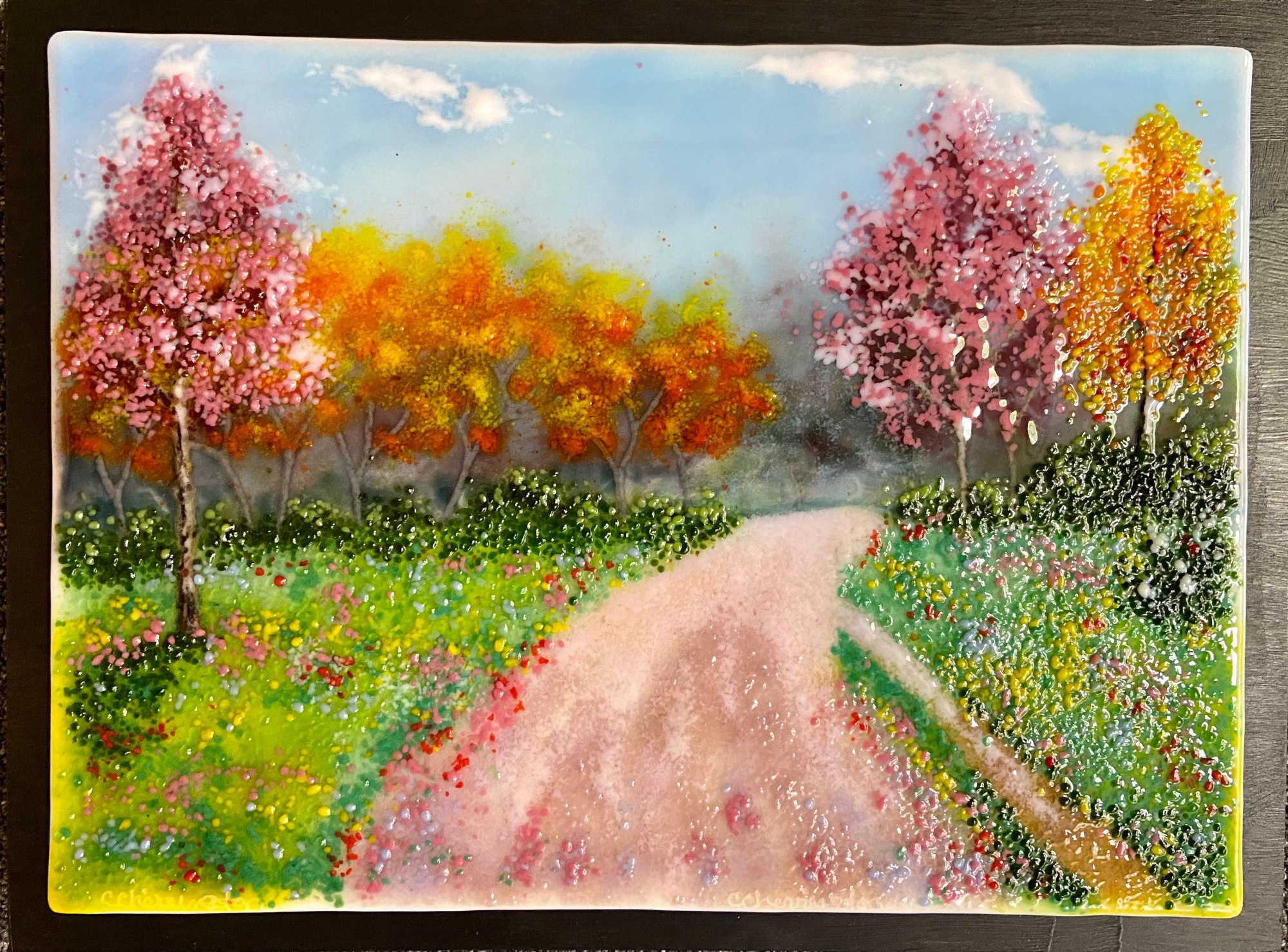 Lots of powdered glass and frit create this road to home. Created with multiple layers and firings. Mounted on painted wood board.