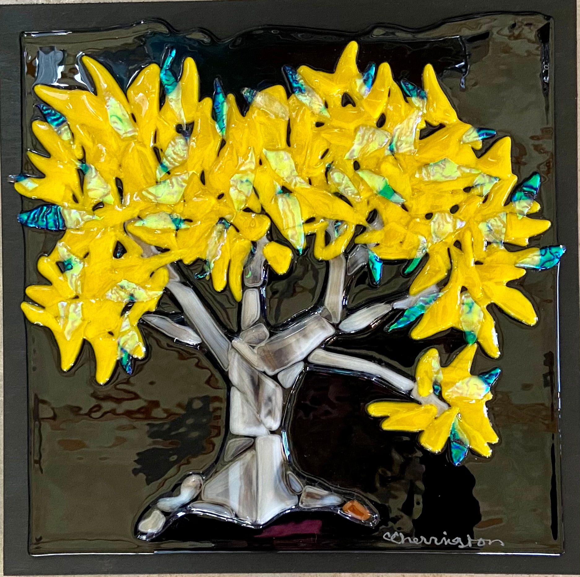 A colorful oak in yellow opaque glass with highlights of emerald blue granite clear dichroic. It is fused to a black piece of glass and mounted on a black board. Ready to hang on gallery wire.