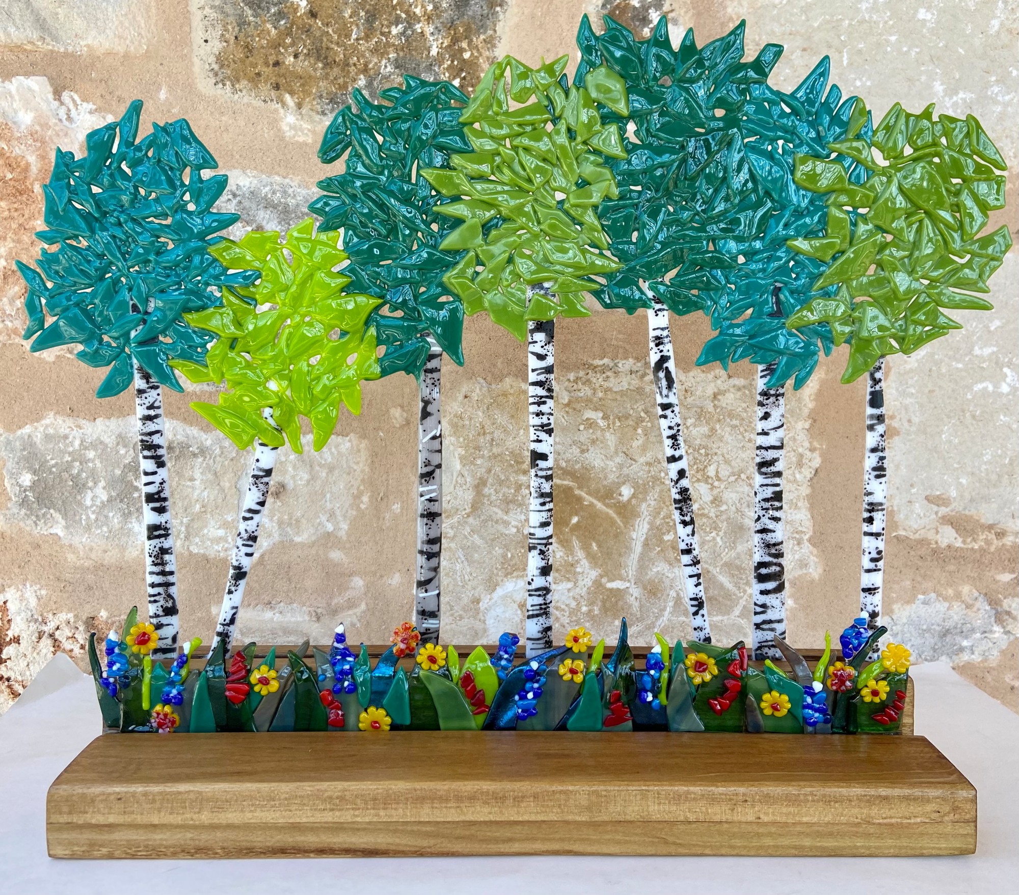 This is a two tier sculpture. Nipped shades of green glass form the leaves of the aspen trees. The second tier is a line of wildflowers that are nestled under the trees. The stand is made of poplar wood.