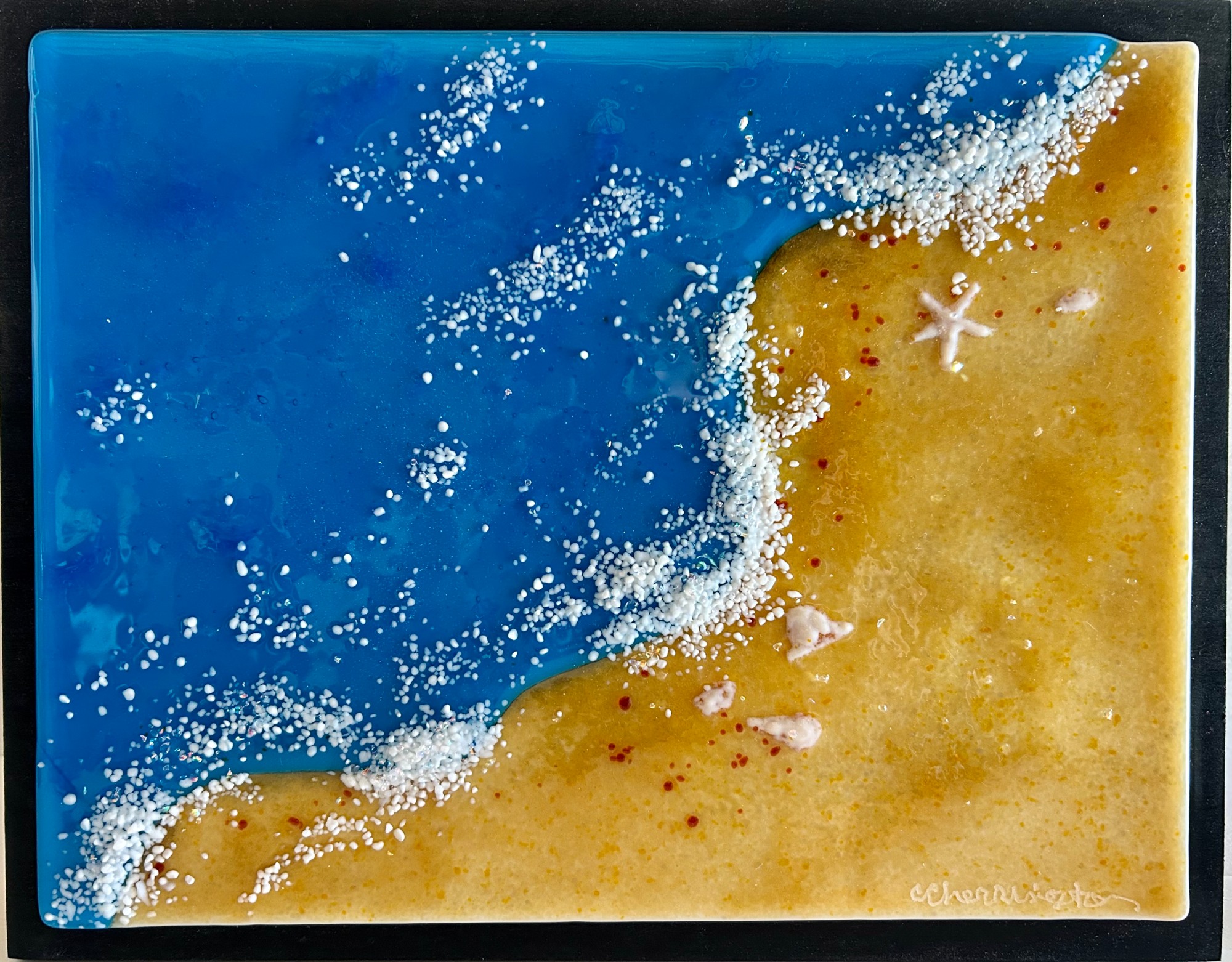 The beautiful blue waters rush up against the sand on the beach leaving shells washed up on the beach. Mounted on a black board and ready to hang.