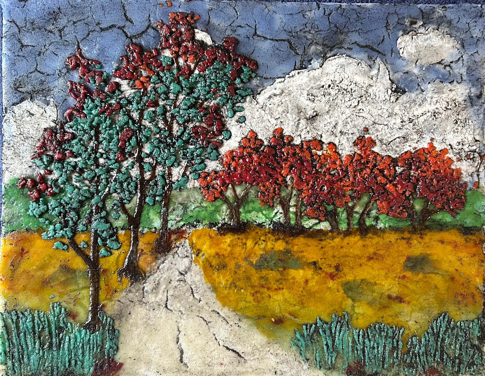 Painted with a paste of glass powder and glue, the glass paste is spread thickly on the base piece of glass using a palette knife. Layered and fired in a kiln multiple times. Mounted and ready to hang.