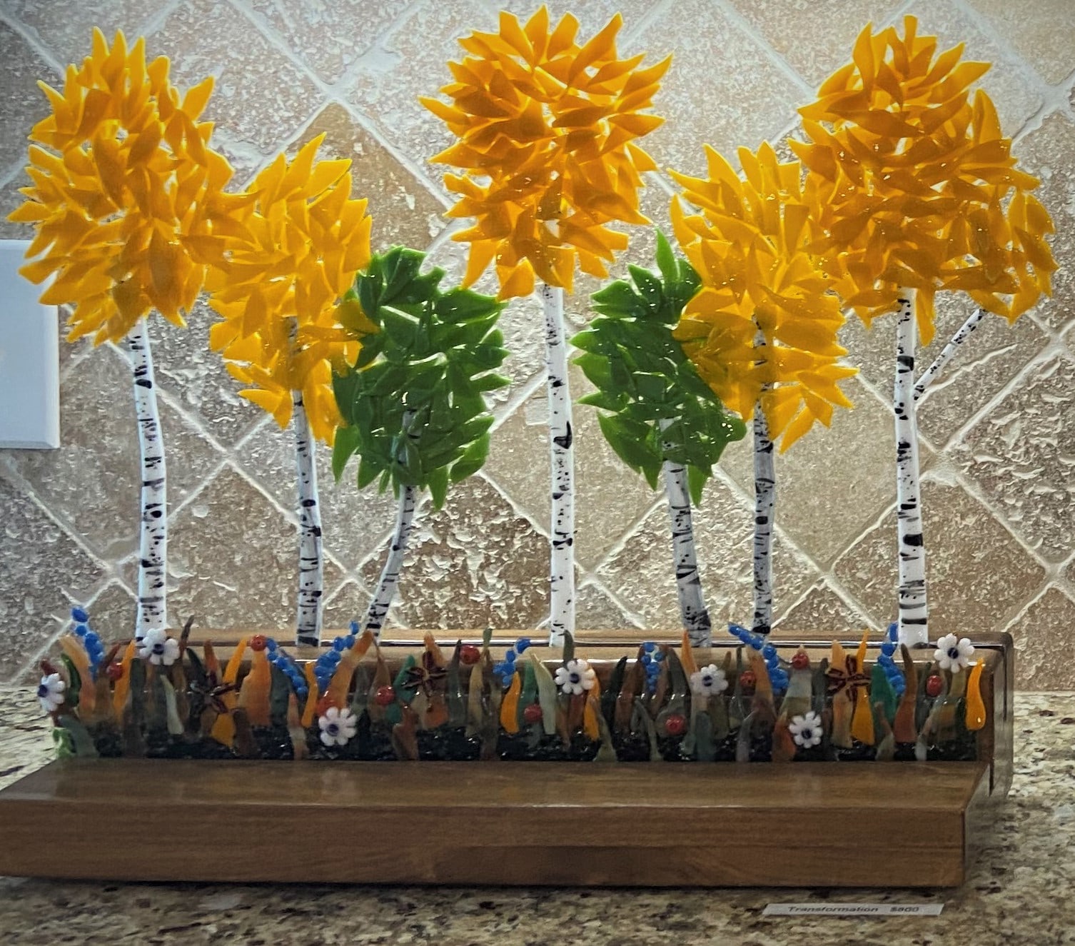 This two tier piece is a forest of aspen trees changing to fall colors amongst a grassy field with wildflowers.