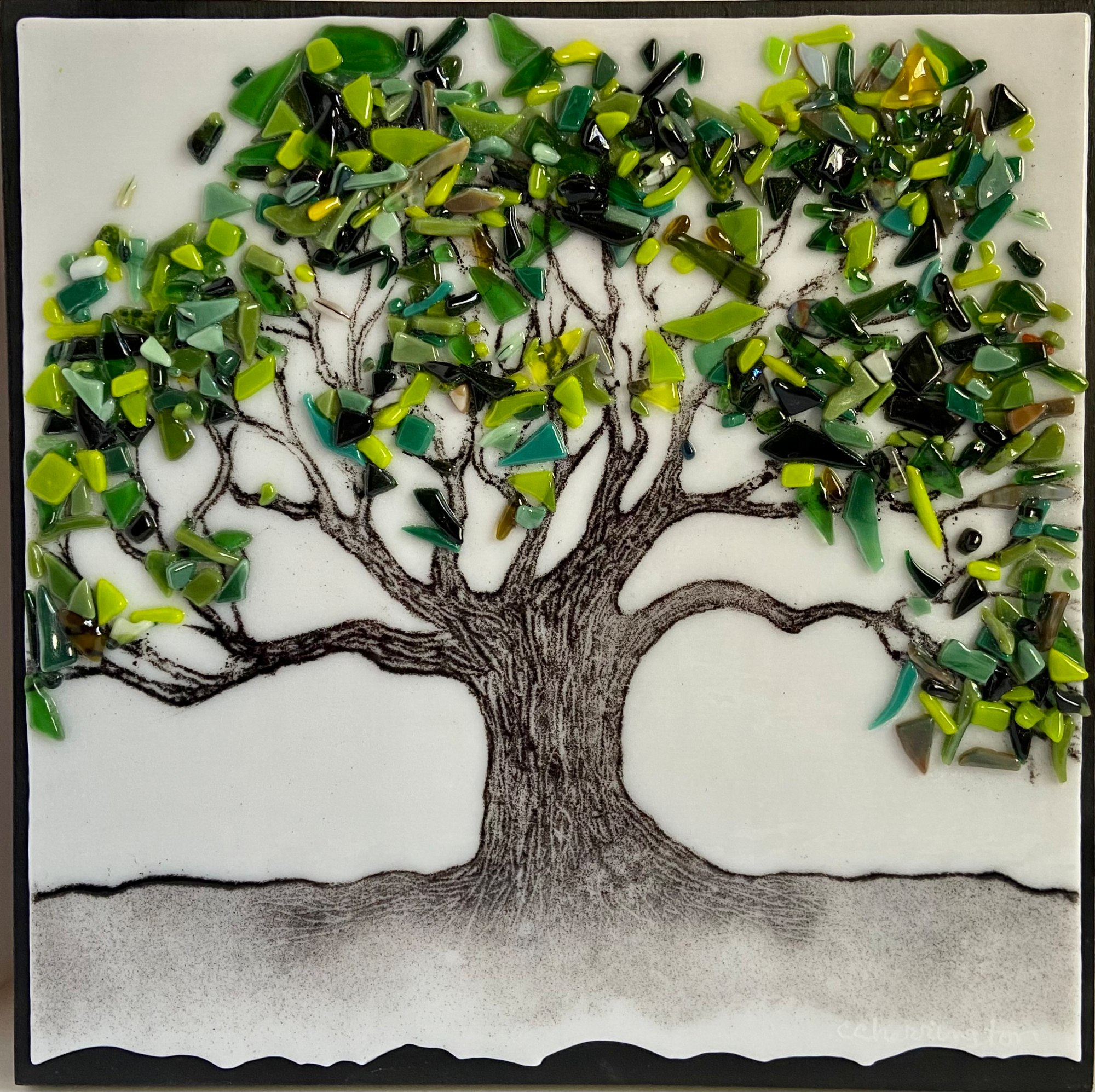 The tree is drawn with black glass powder. Chards of different colored green glass create the foliage. Mounted on painted wood board.