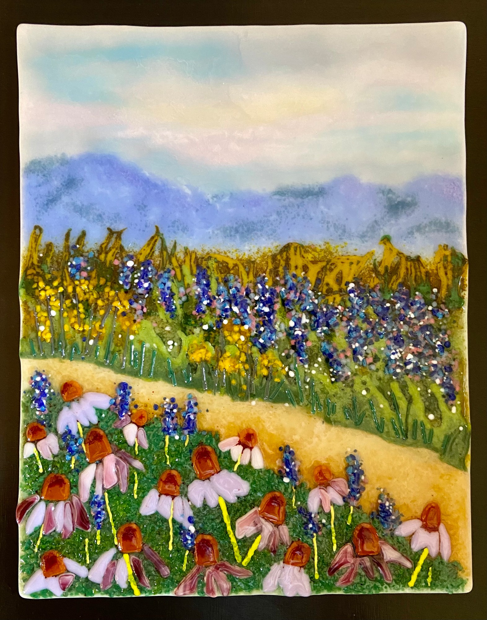 My friends in New Mexico planted this "natural" garden. Multiple layers of powdered, cut and crushed glass and 3 firings create this colorful landscape with lots of texture.
