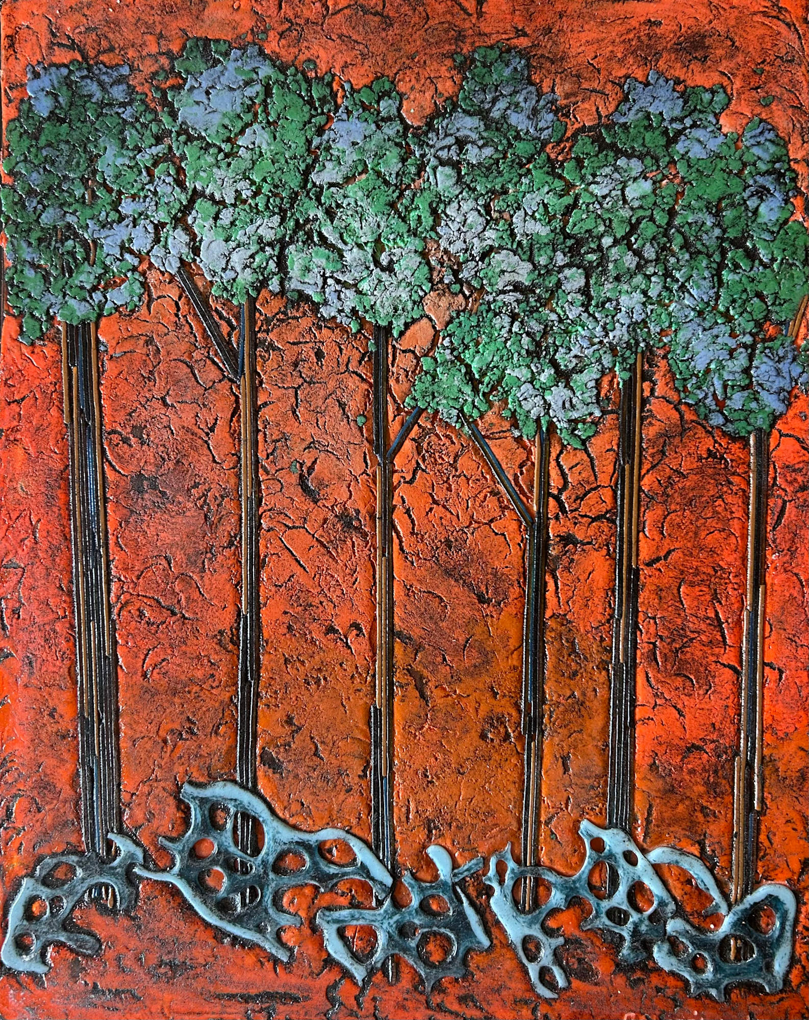 With a vivid orange background stand tall slender trees. A contemporary piece constructed with glass paste and fired to a matte finish.