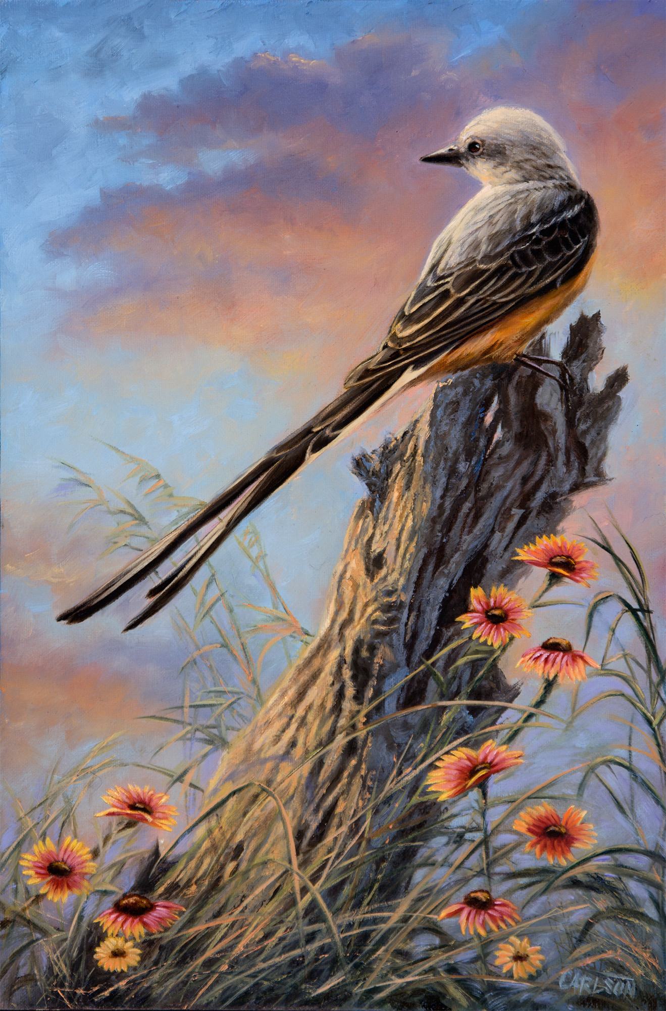 The elegant scissor-tailed flycatcher is one of the most beautiful birds seen on the southern great plains, prairies, and open fields. Often the birds perch on fence posts and wires displaying their long, deeply forked, graceful tail feathers. As an artist, I enjoy painting this ideal subject with colors of pale grey and accents of salmon.