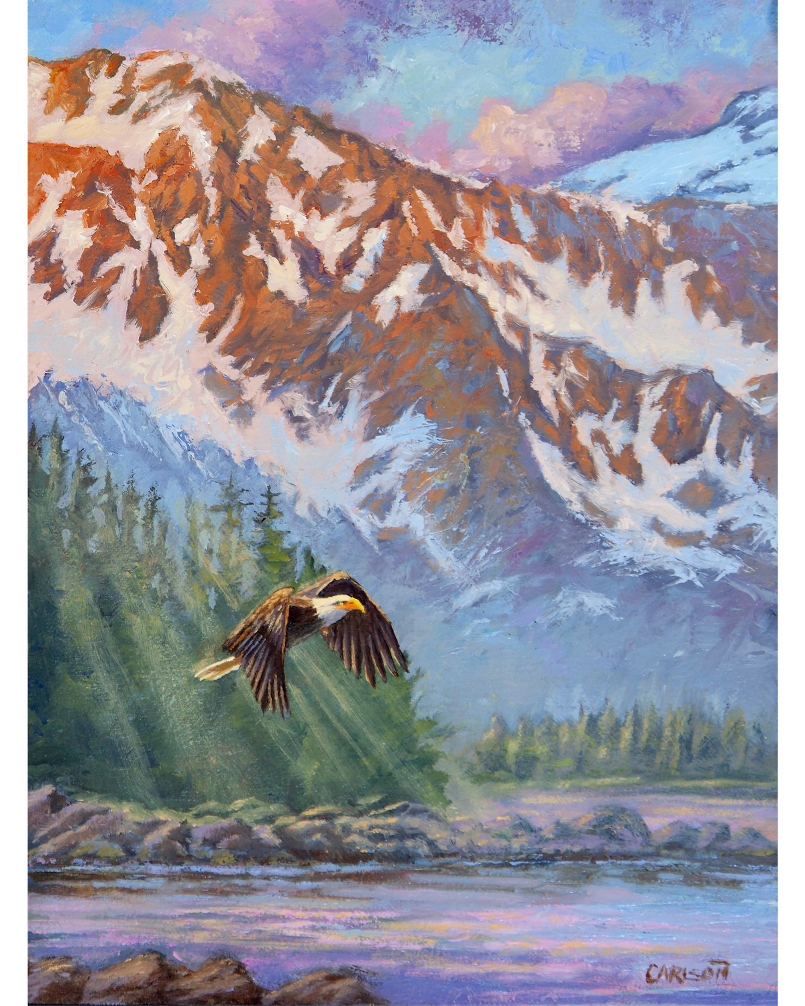 In this painting, I sought to capture the awe-inspiring beauty of Alaska's majestic mountains, where nature unveils its splendor in dramatic light. The interplay of sunlight streaming through the clouds creates a breathtaking backdrop, illuminating the rugged peaks and casting a serene glow over the landscape. A solitary bald eagle soars through the radiant beams, embodying the spirit of freedom that defines this wild frontier. In “Nature’s Majesty,” I strived to capture a sense of connection to the raw beauty and tranquility of the Alaskan wilderness, inviting you to pause and reflect on the wonders of nature.