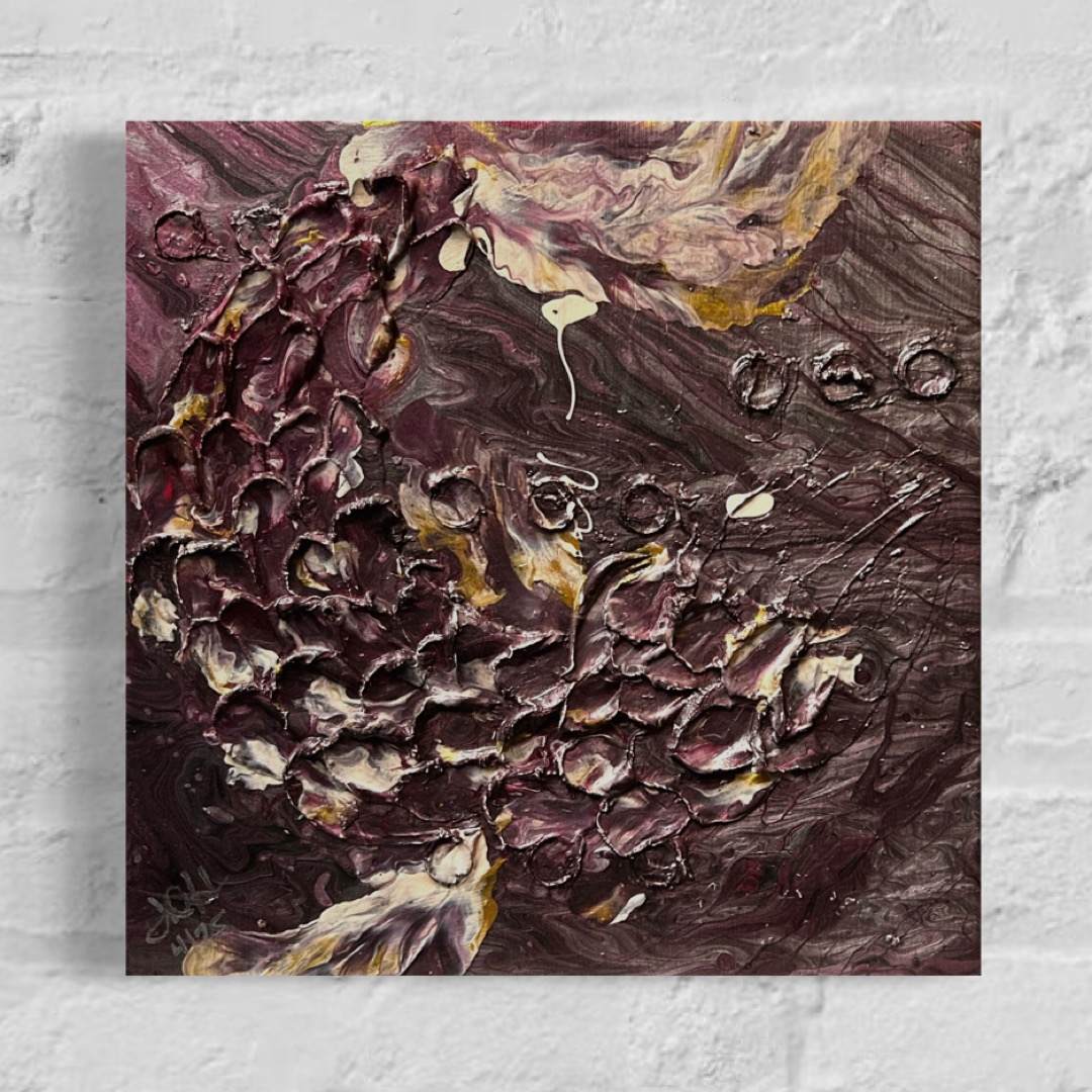 This abstract textured painting captures the ethereal essence of a great fish gliding gracefully through an unseen cosmic ocean. The intricate layers and dynamic textures evoke the interplay of light and shadow, as if the fish is navigating celestial tides. Merging the organic with the otherworldly, this piece transforms a moment of motion into a lasting artistic expression, breathing life into the story of a swimmer transcending the depths.