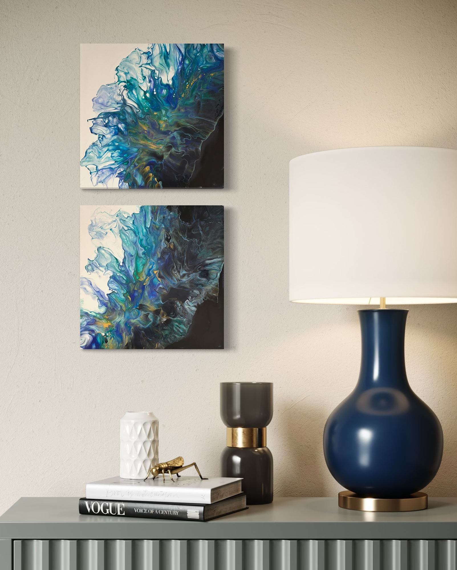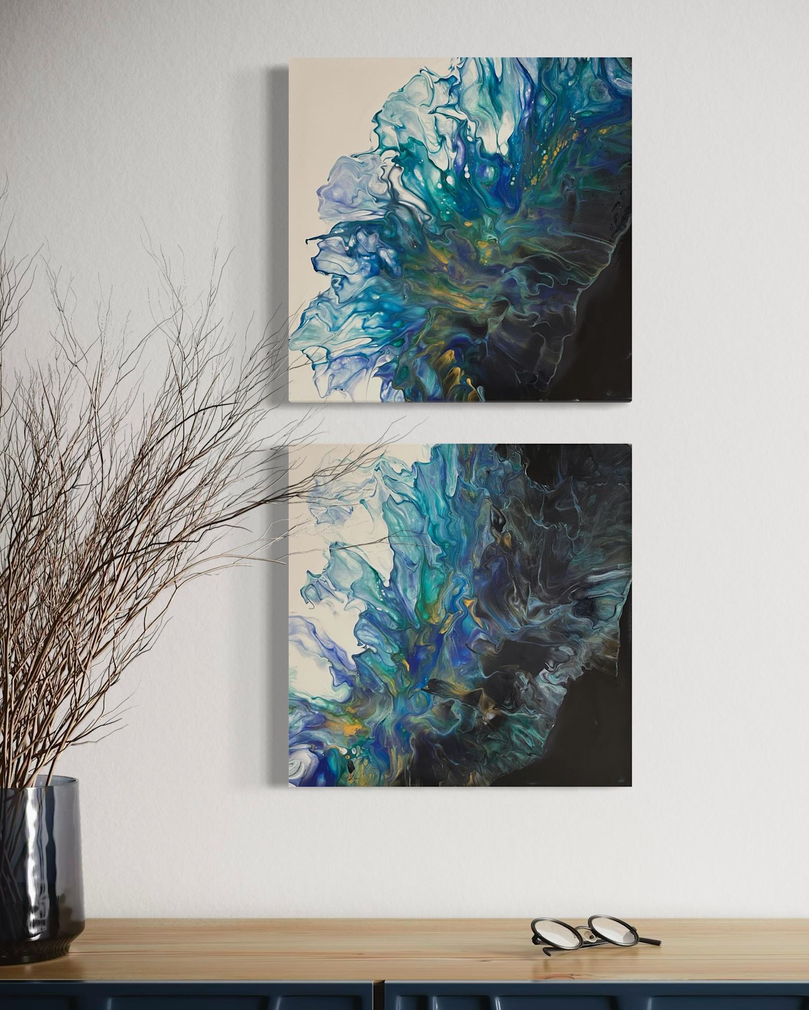 This captivating duo of abstract paintings evokes the serene beauty of oceanic tides under a celestial glow. Shades of blue flow seamlessly with touches of gold, creating a harmonious balance between depth and light. Together, they tell a story of duality and connection, capturing the ebb and flow of dreams and the infinite rhythm of nature. These pieces transform the tranquility of the sea into lasting artistic expressions, breathing life into the essence of unity and wonder.
