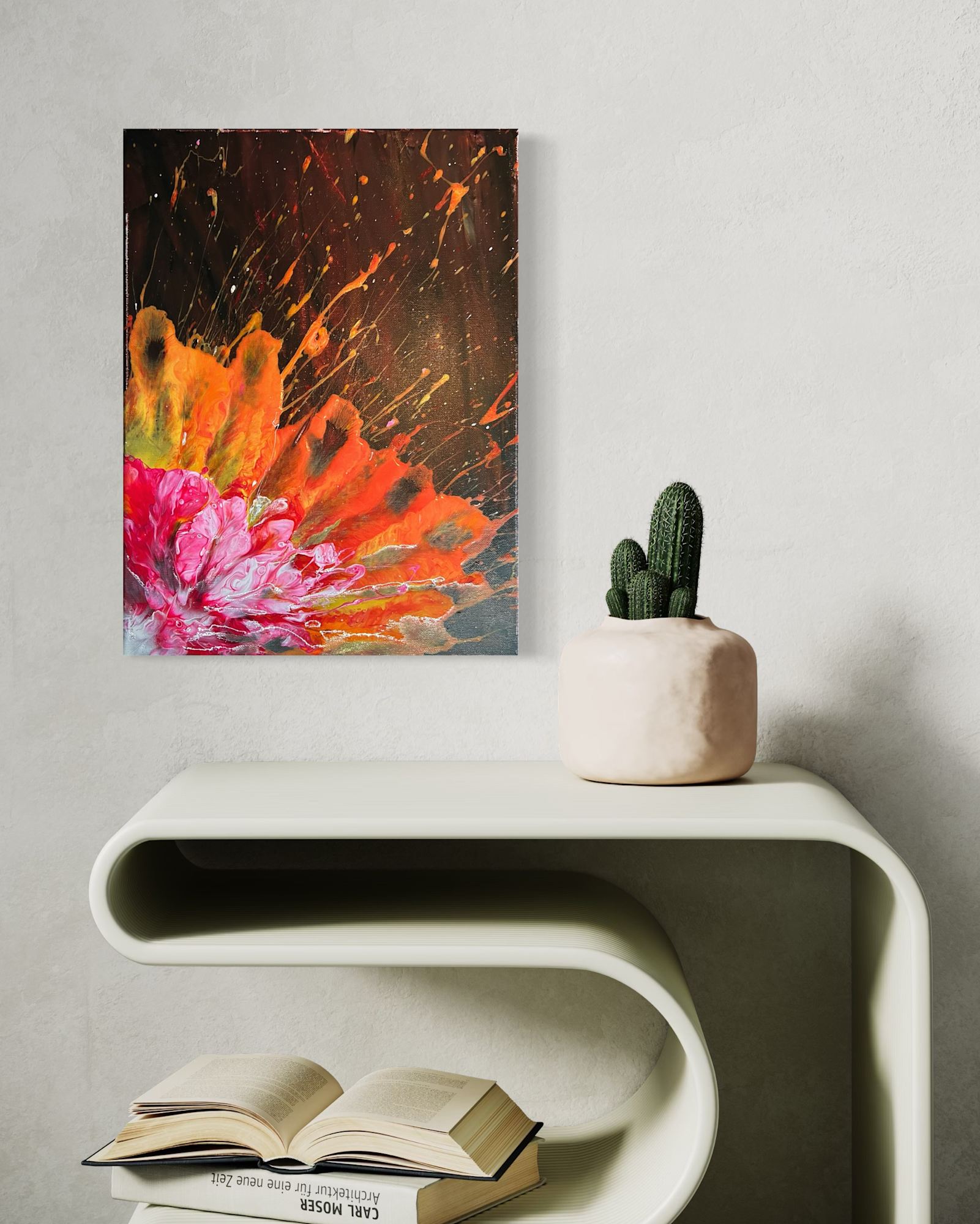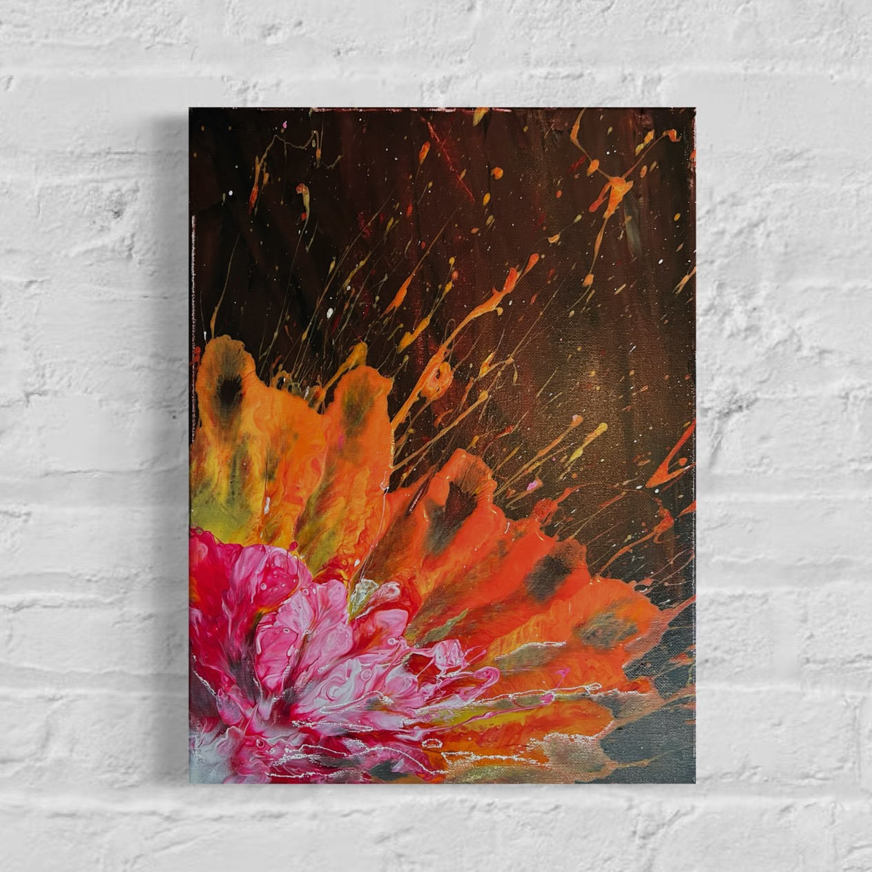 Flare of Creation bursts with raw energy and vibrant intensity, capturing the moment where chaos transforms into beauty. Fiery splashes of orange and gold radiate outward, like an explosion of cosmic energy birthing new life, while delicate swirls of pink and white anchor the composition in organic grace. The contrast between the dark, infinite background and the luminous, erupting bloom evokes the dual forces of destruction and creation, reminding us that from fire and fury, new beginnings emerge. This piece is a testament to the power of transformation, where light and color ignite the canvas in a dance of endless possibility.