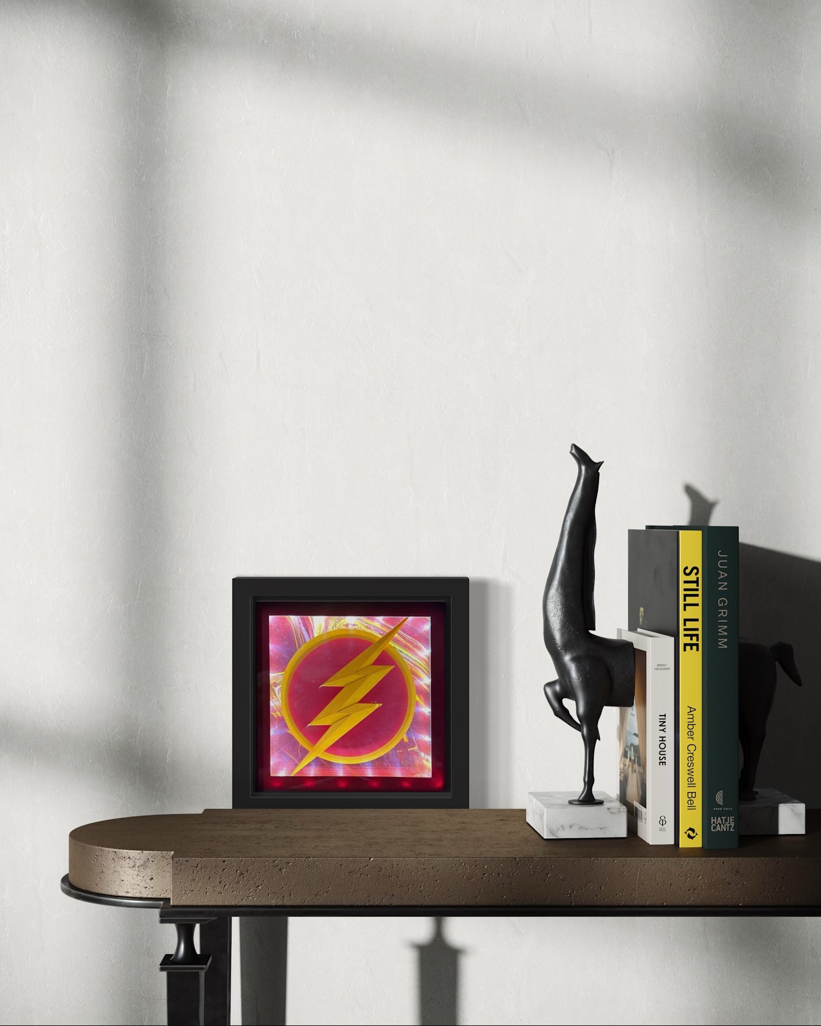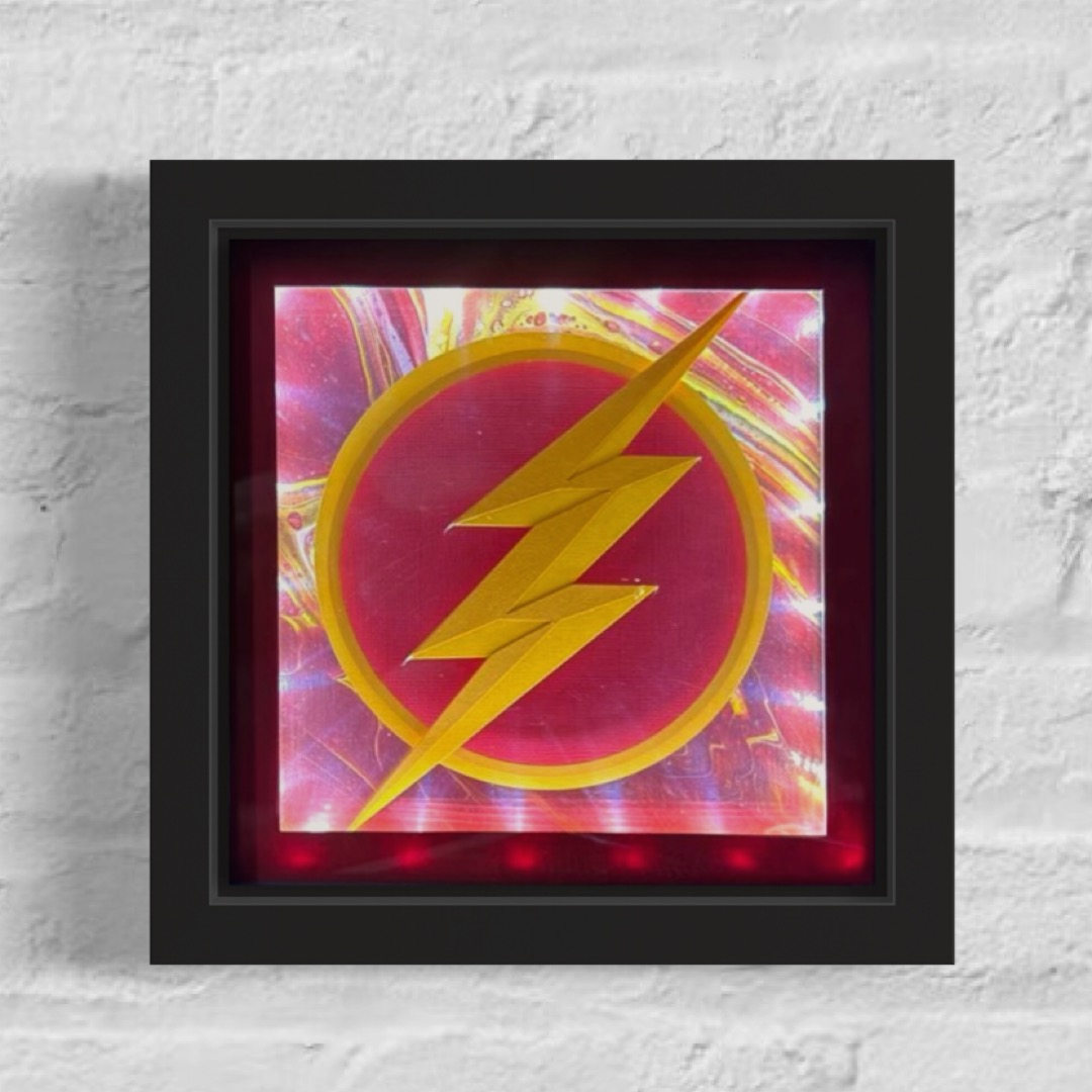 A stylized Flash emblem cuts across a hand-poured abstract sky, capturing the instant a streak of energy tears through the atmosphere. The acrylic pour background is an original, one-of-one painting, with flowing currents and subtle lightning-like veining that shift as you move around the piece. Dimensional cut-paper construction lifts the symbol forward inside the shadowbox, casting real shadows and giving the mark a sculptural presence that feels like contemporary art rather than traditional fan merchandise. Intimate in scale yet visually bold, it creates a focused focal point on a gallery wall, bookshelf, or office display.
