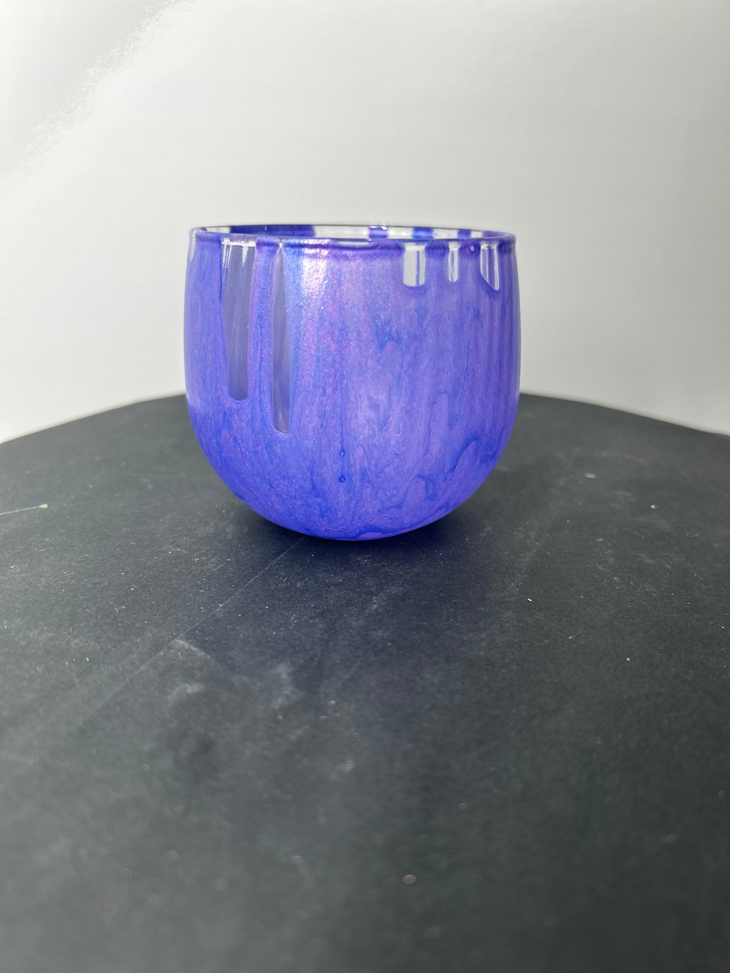 Soft iridescent hues of violet, pearl, and blue drift across the surface in a gentle pour of color. When lit, the votive comes alive — light and pigment intertwining to cast shifting reflections that dance through the glass. Created through an abstract pour technique, Lilac Whispers captures the quiet poetry of illumination — a whisper of color, a flicker of light, a moment suspended in glow.