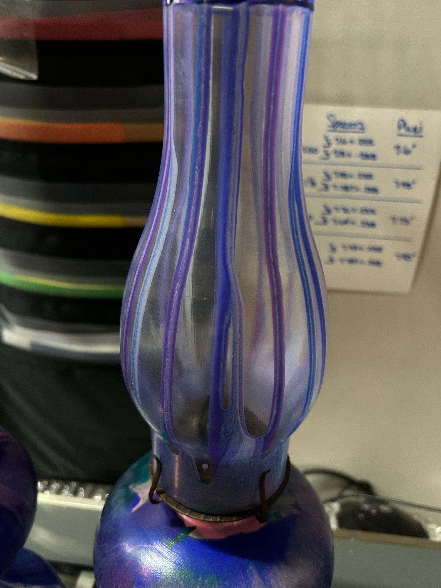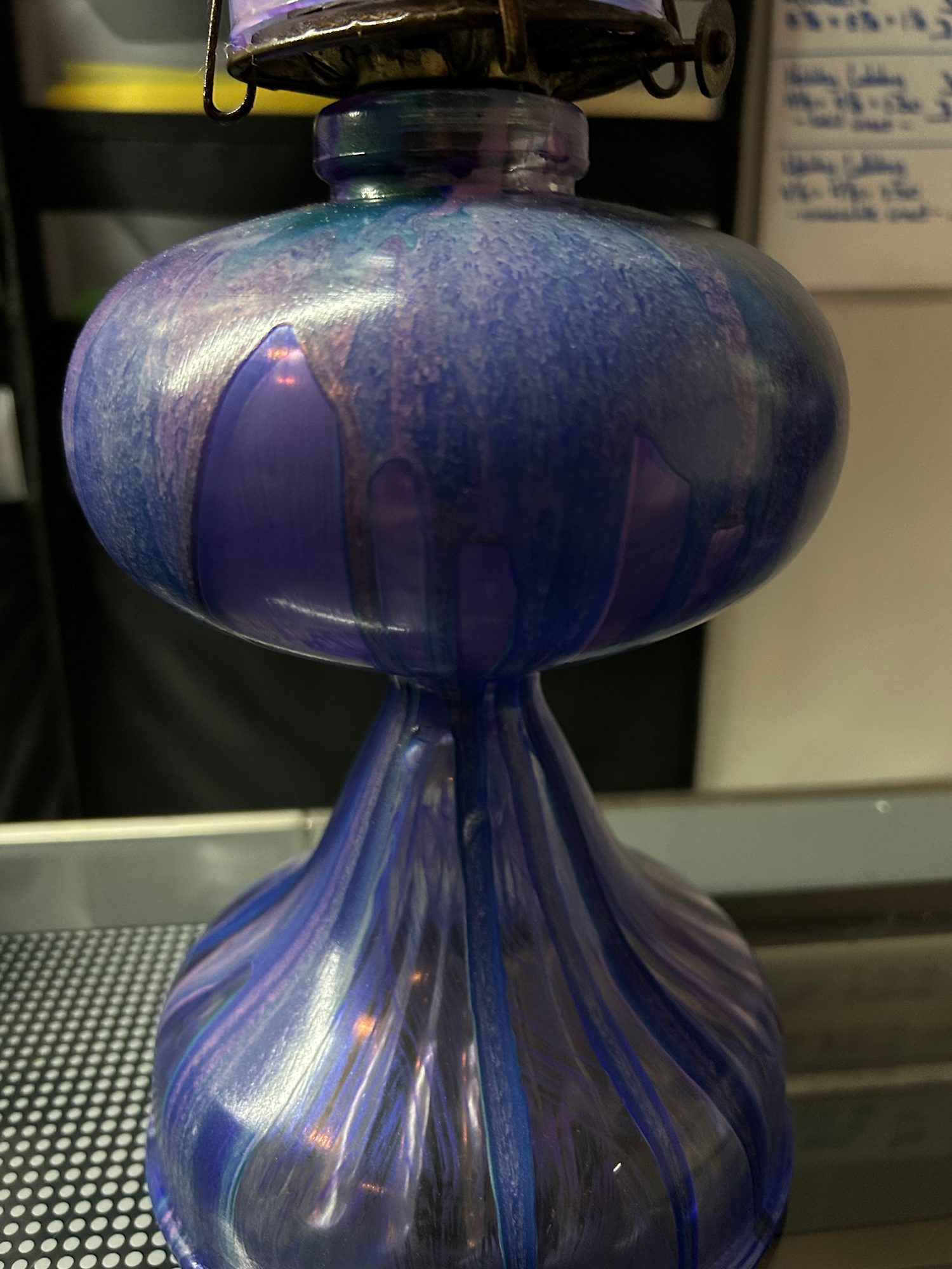 This exquisite pair of hand-painted hurricane lamps transforms functional lighting into luminous art. Each lamp features a mesmerizing acrylic pour finish in deep purple, violet, and turquoise with iridescent shimmer that shifts in changing light. The flowing colors cascade across the sculptured glass base and pedestal, complemented by purple-striped glass chimneys that create an ethereal glow when lit. These one-of-a-kind pieces merge vintage charm with contemporary abstract artistry, bringing ambient beauty and artistic sophistication to any space. Sold as a matching set, they create stunning symmetry for mantels, dining tables, or romantic evening displays.