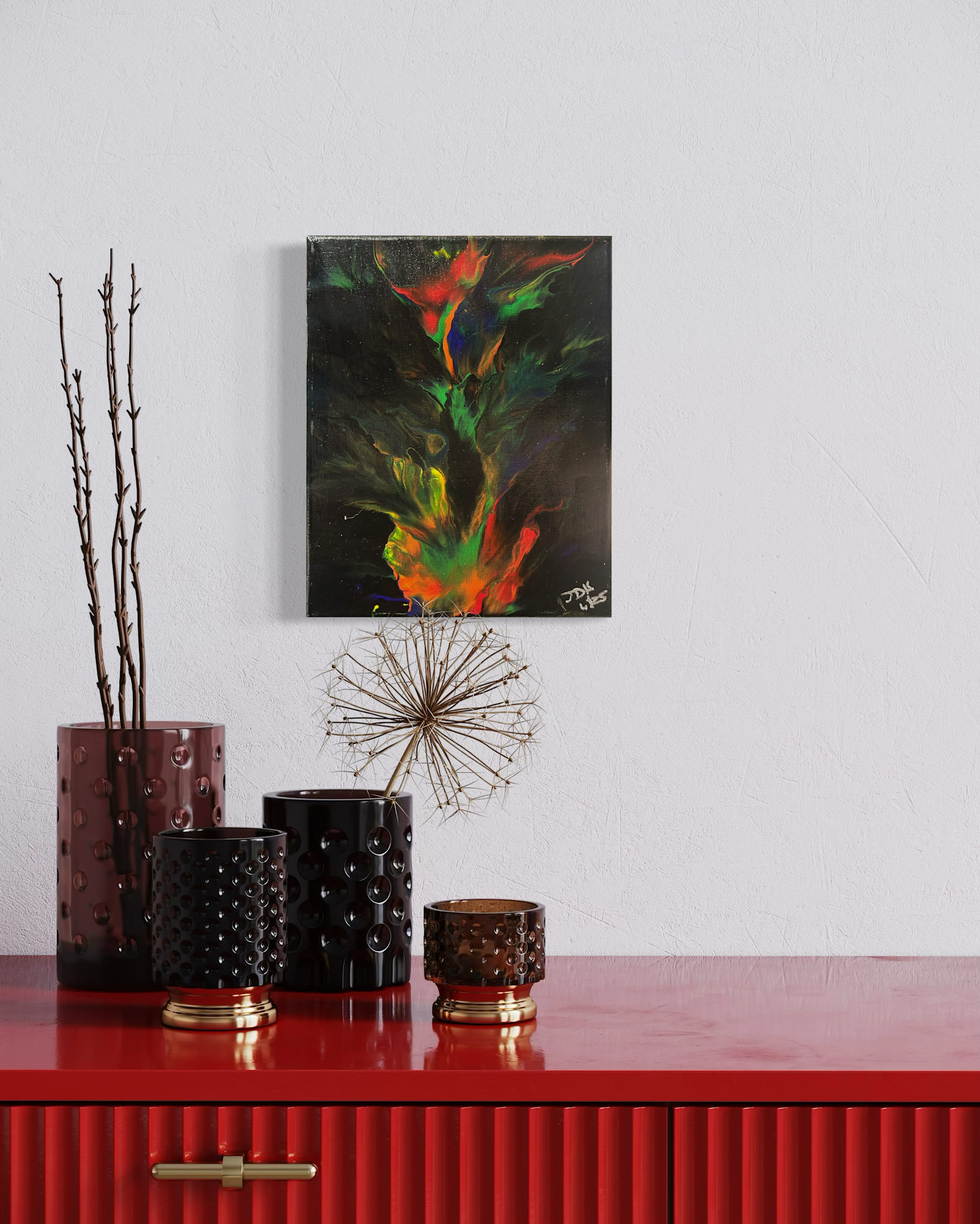 This original dimensional canvas translates the universal story of rebirth into pure color and motion. The acrylic pour technique creates organic, unrepeatable patterns that mirror actual flames and the flowing movement of a bird in flight. The vertical composition naturally draws the eye upward, creating a sense of triumph and emergence. The vibrant warm palette against deep black background creates immediate visual impact with powerful symbolic meaning. This piece works in spaces that value art with both beauty and deeper significance—modern offices, creative studios, or anywhere that celebrates resilience and transformation. Fully painted wrapped edges allow the phoenix to feel like it’s rising through actual space rather than confined to canvas.