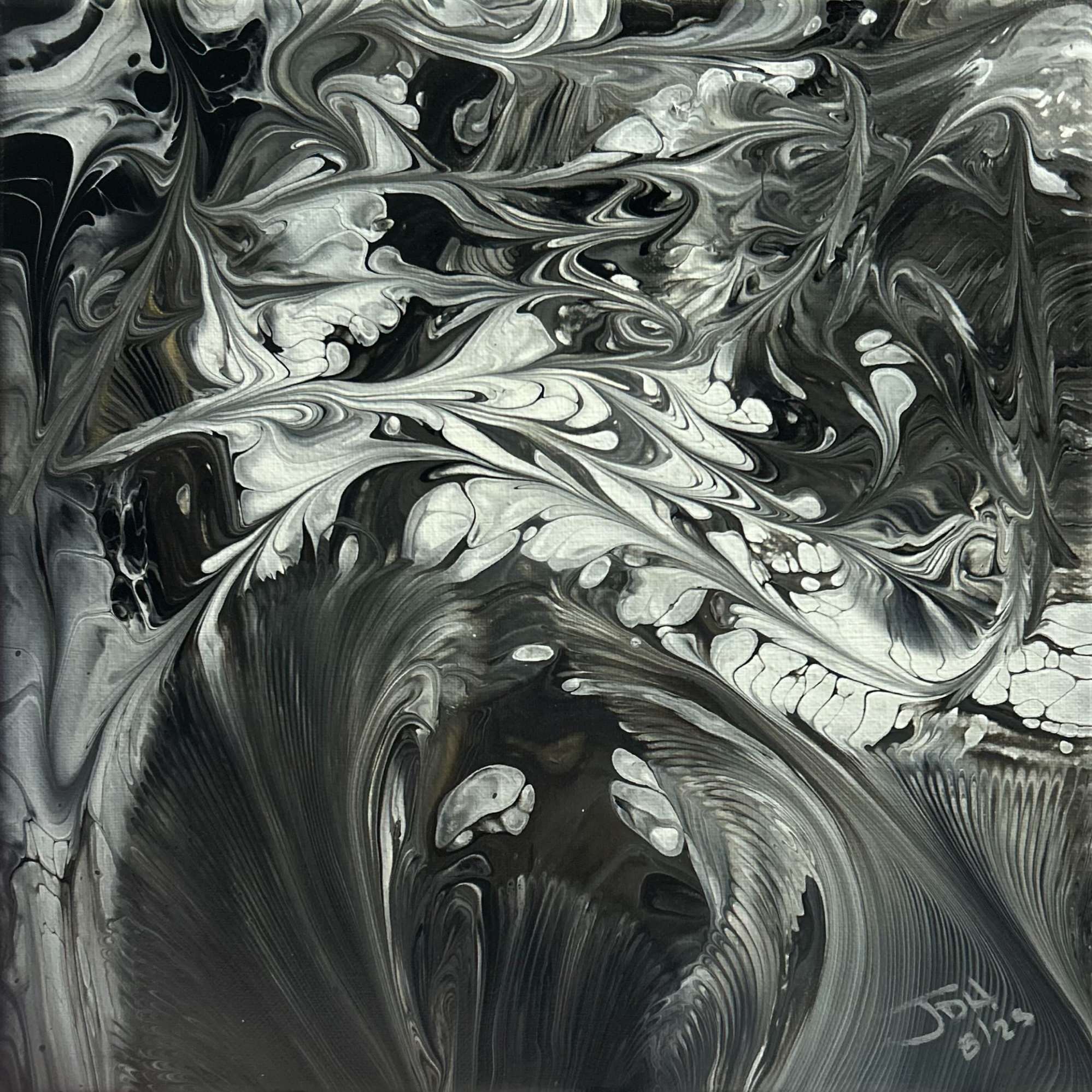 Feathered swirls of graphite, pewter, and bone white drift across the canvas like wings cut from smoke. Fine filigree lines curl into barbs and plumes, while soft cells glint along the edges like frost. The motion crests and settles in quiet arcs, balancing lift and shadow. A monochrome study of flight and stillness—delicate, deliberate, and hypnotic up close.