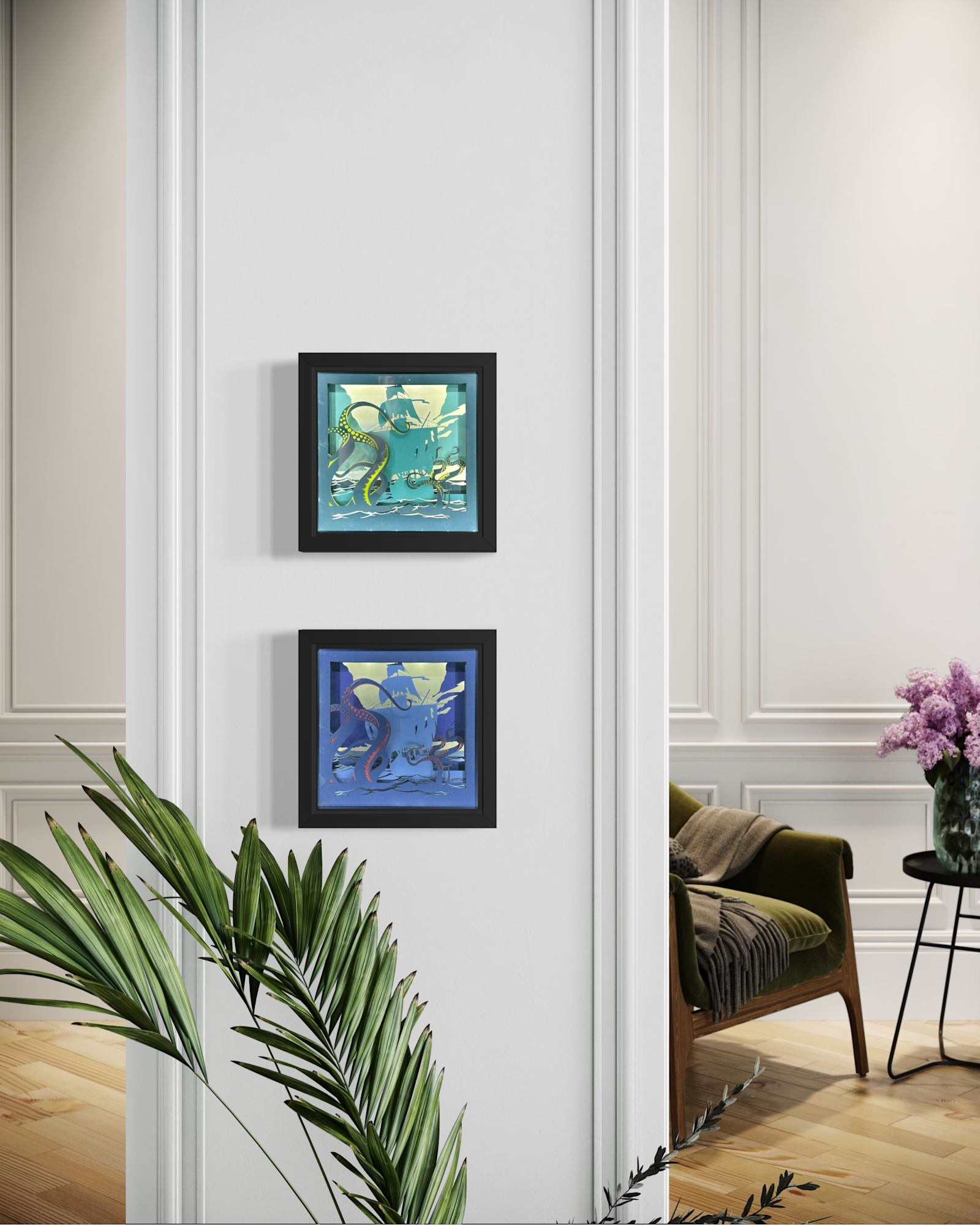 That moment the captain knows it’s over—kraken’s got the ship in chokehold, tentacles crushing wood while sails flap useless against the purple storm. Layers drag you under from deck chaos to black waves, light hitting suckers like they’re still squeezing.
