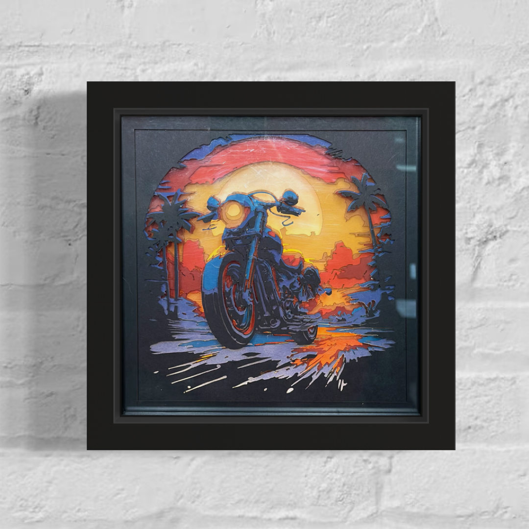 Dimensional presence: Built on the Creatively Cutz B.O.X. format, the Harley, palms, and mountain silhouettes lift off the surface, casting shifting shadows that change with the light and give the piece a sculptural feel.