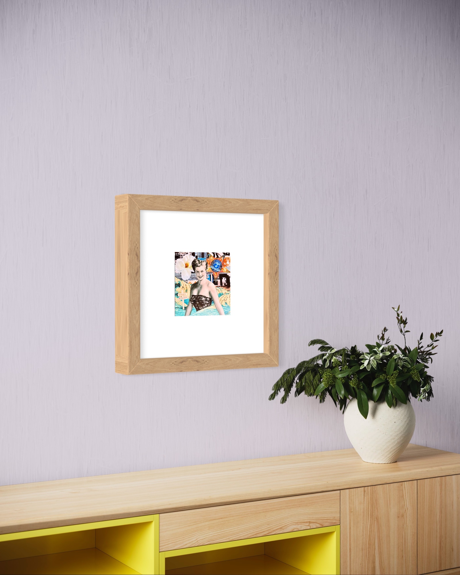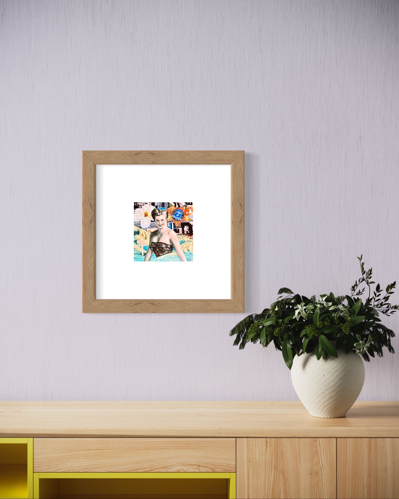 Original Collage, images from recycled magazine material, found reimagined images, analog collage artwork by Artist Cristina Sayers; 8”x8” for n cotton flat canvas, matted Unframed, 2023.