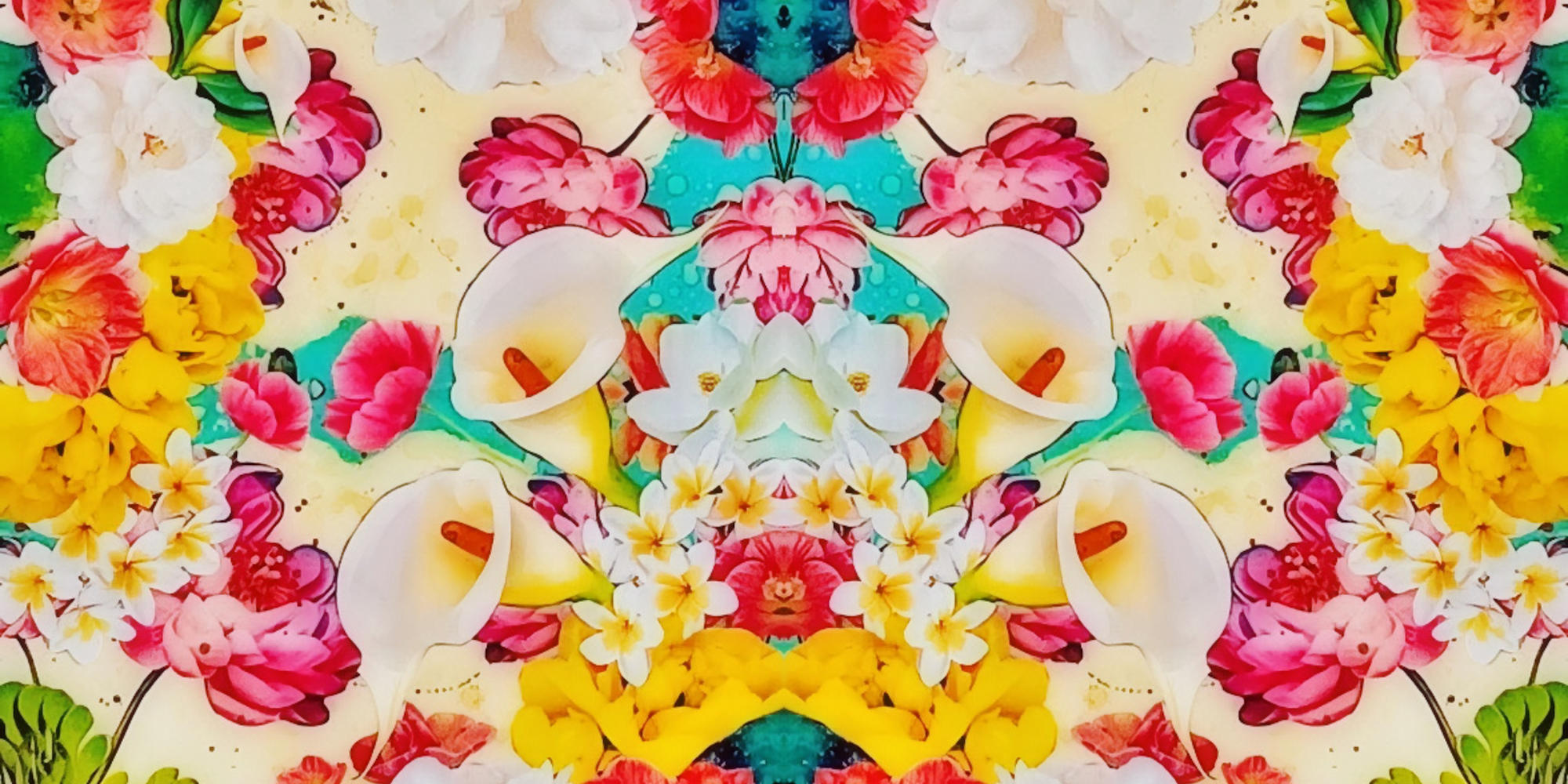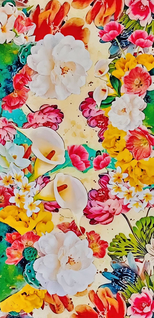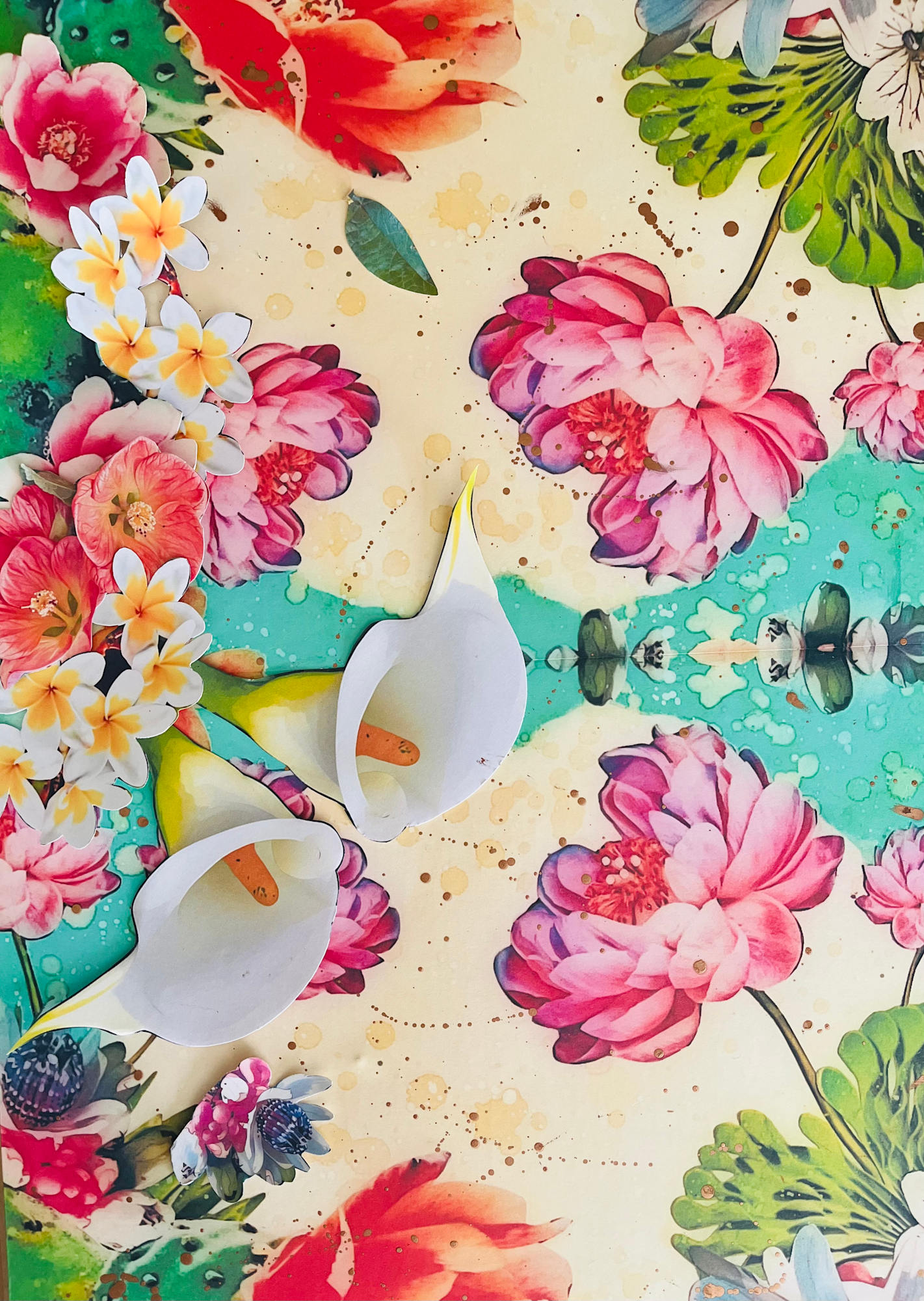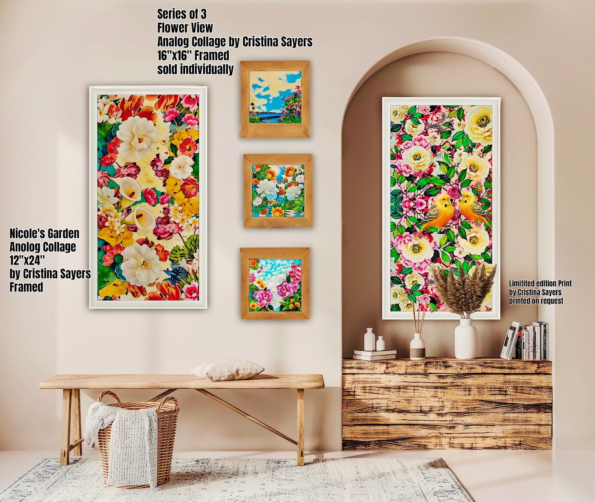 The collage artwork presents our friend Nicole’s vibrant spring garden on 34th Ave, in Santa Cruz. Filled with an assortment of colorful flowers and blooming weeds, such as wild roses, and Chrysanthemums.