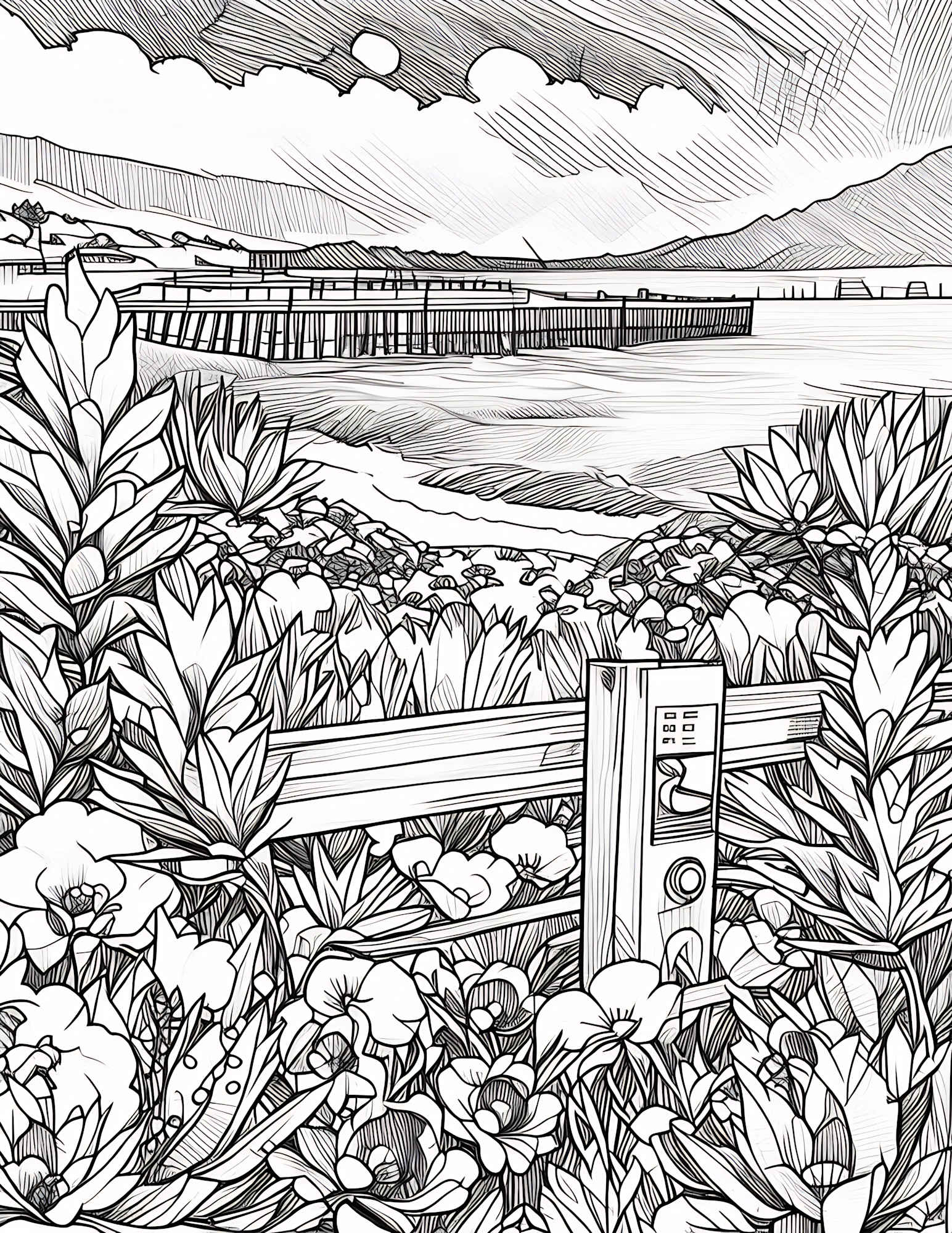 This captivating collage art piece presents a stunning view of Capitola Wharf and Ocean Peak through the lush greenery from Portola Dr. The composition intertwines vibrant blooms, lush foliage, and delicate leaves, framing the serene vista.