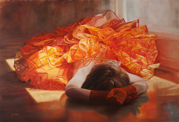 In the sunrise and sunset we see a cosmic balance of opposites representing completion. While the sun fires up our passions and heats up our hearts to the potential of life that abounds, it also warms and quiets the spirit. We see this dichotomy of opposites in “Summer Solstice” as we are drawn in by the energy and flow of the fabric yet discover the muse in a relaxed almost meditative state of repose. The arch of the woman’s skirt mimics the path of the rising and setting sun. She seems to be lingering in a moment, just as the sun lingers on the solstice, the longest day of the year. As an ancient symbol for the soul, the sun brings renewal and hope as we embrace its warmth and comfort.