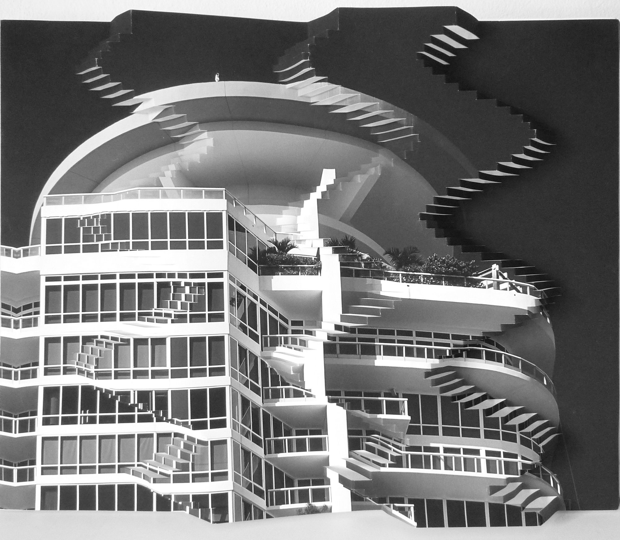 In this work Antonow addresses a unique path by deconstructing traditional photography perceived as a flat representation of reality to build a new three-dimensional space highlighting fragmented parts by re-inscribing them as overlapping planes. In this way, the artist creates an atmosphere that is divided from different points of view and invites the action to recompose the original lines and volumes in a new order through a thorough analysis.