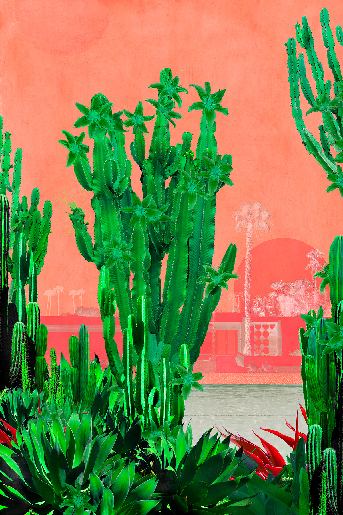 Cactus Club, inspired by Palm Springs and the Palm Desert, California. A mixed media collage of Nadia's botanical photographs, and drawings from her trips to southern California. Imagined landscapes part of the Botanical Cactus series.