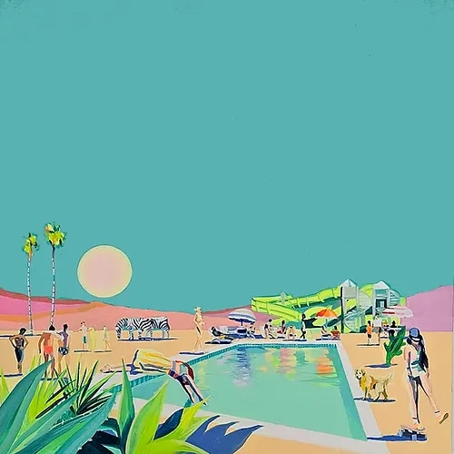 ‘Away Having Fun’ is painted using oil and acrylic on canvas. It is a large painting on an artist’s high quality Windsor and Newton stretcher which is warp resistant. The painting is made using large brushstrokes and the texture of the paint and brush marks are visible on the surface of the canvas. It is painted using a combination of oil and acrylic paint which gives it extreme vibrancy and shine in some areas. In some areas of the painting the oil pigment is fluorescent which gives intense strong colour.