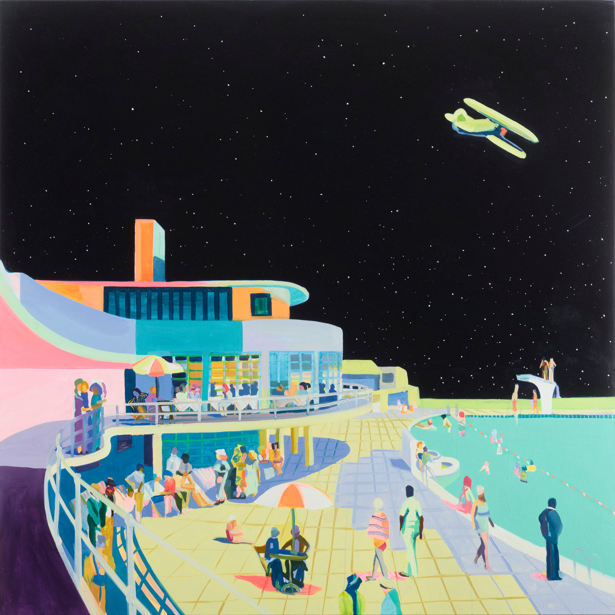 I knew I wanted to paint a Saltdean night scape. I found some old imagery of the lido from when it must have first opened. The way the figures were dressed and how they were interacting was so interesting if you zoomed in right close to the painting. There were a row of nurses with strange hats walking though, and upstairs in the café people sat at table dressed with gingham tablecloths and doors open.