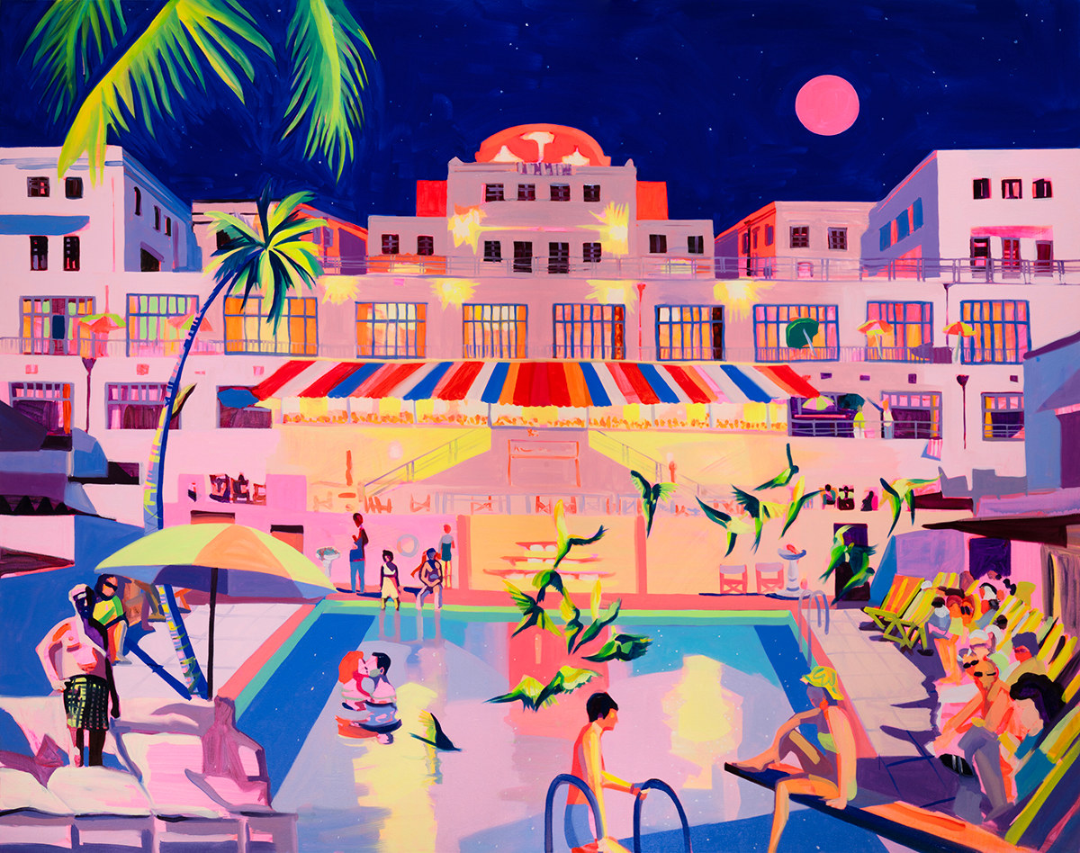 Sadly, the hotel was closed and eventually turned into a block of flats, but I found this beautiful old image of the pool at night and couldn’t stop thinking about it. There was something in the lighting, the symmetry, and the atmosphere that reminded me of Wes Anderson’s Grand Budapest Hotel. This painting has that same nostalgic, cinematic charm.