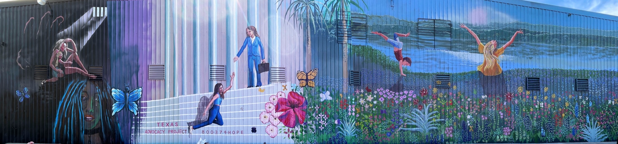 Transitioning from Abuse to Hope & Freedom - benefit mural for Texas Advocacy Group mural was a group project done for and with the Ascension Leadership Academy (ALA) , project headed by Julie Burnett, The probono project raised $85, 056 for the Texas Advocacy Group by members of the ALA plus generated a $90,500 grant from the Impact Austin Foundation. The project was done with a score of volunteers and a great deal of support by the ALA who through their network donated the use of the massive boom lift and all the paint from local Home Depot stores.