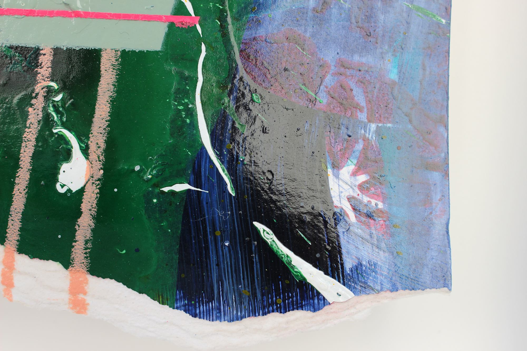 I was already on my way to the trash with the pieces in my hand when the beautiful torn edges of the approximately 600g handmade paper caught my eye—thankfully! So instead of throwing them away, I continued working on the torn pieces. The first theme in the series was "STRIPES", the 2nd is "URBAN JUNGLE".