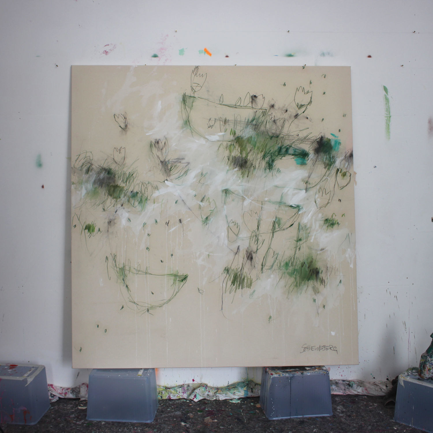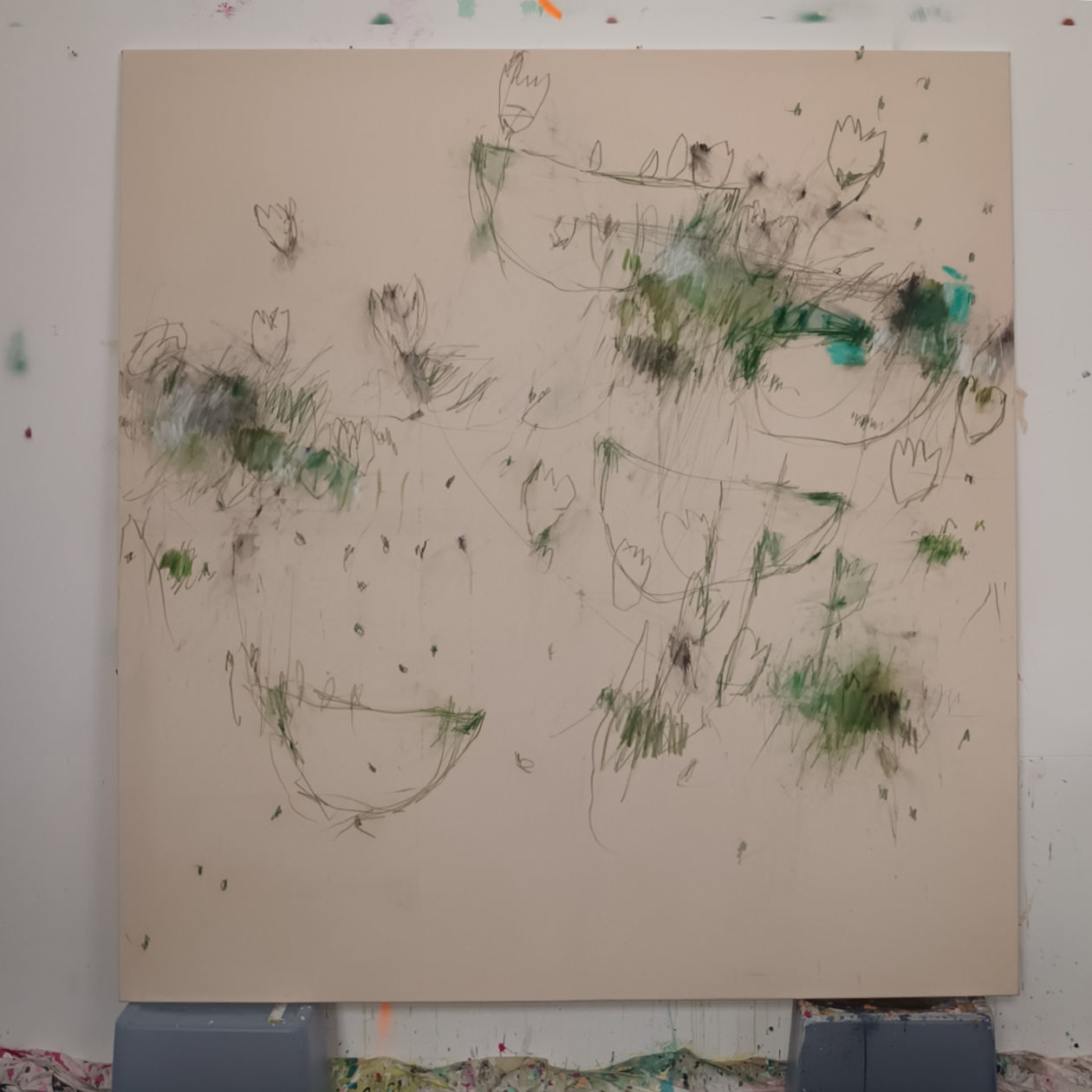 After days of reflection, I knew how to complete the composition: by adding white—not as a color, but as a gesture. It helped define form, emphasize movement, and create contrast with the creamy canvas and green lines. The result was exactly what I envisioned.