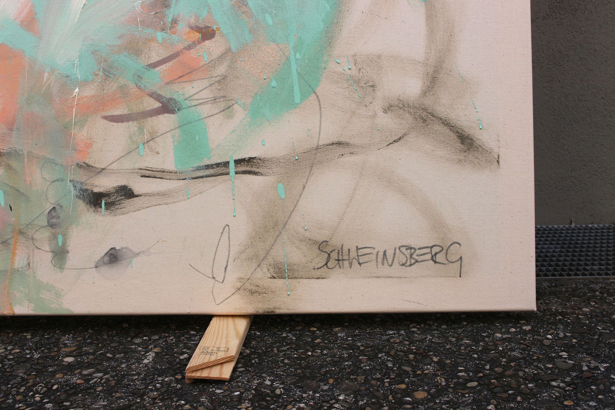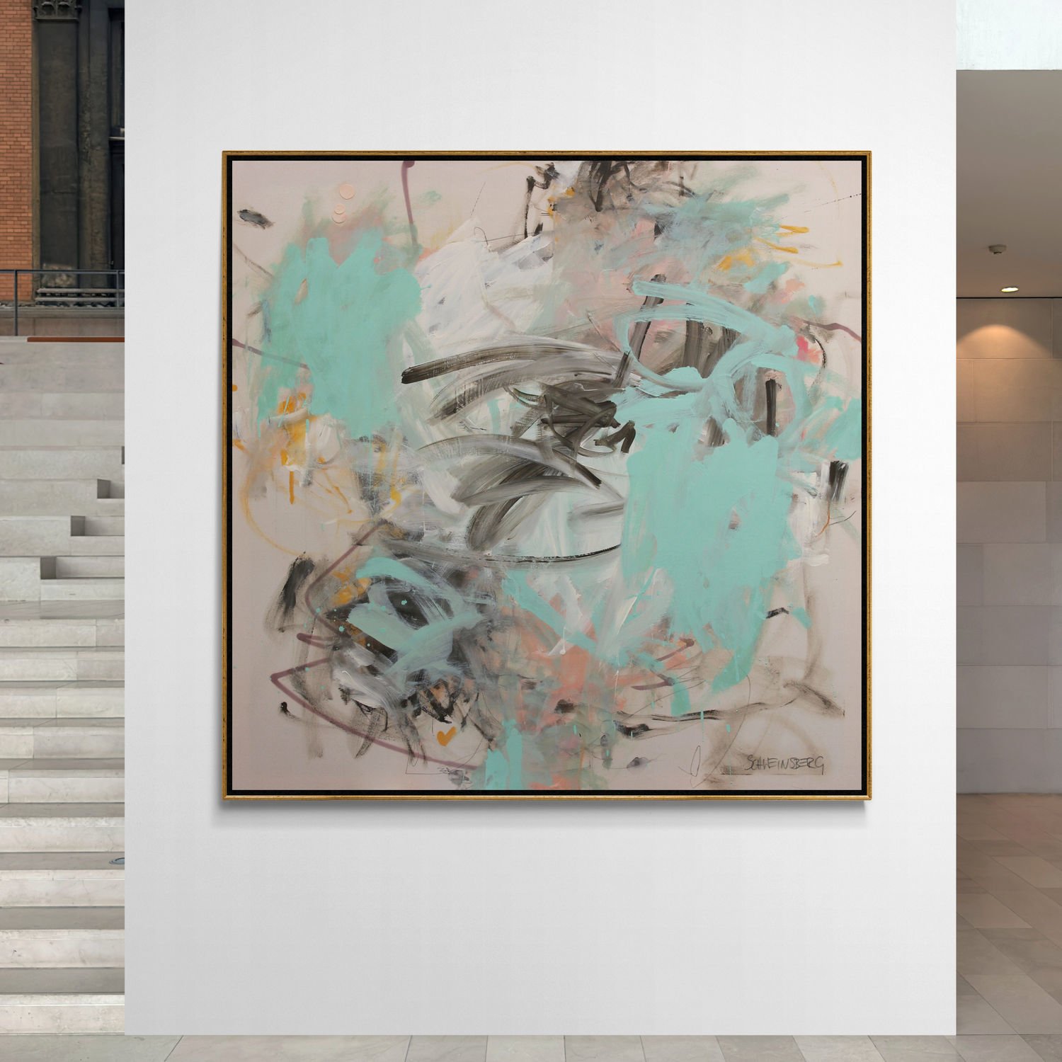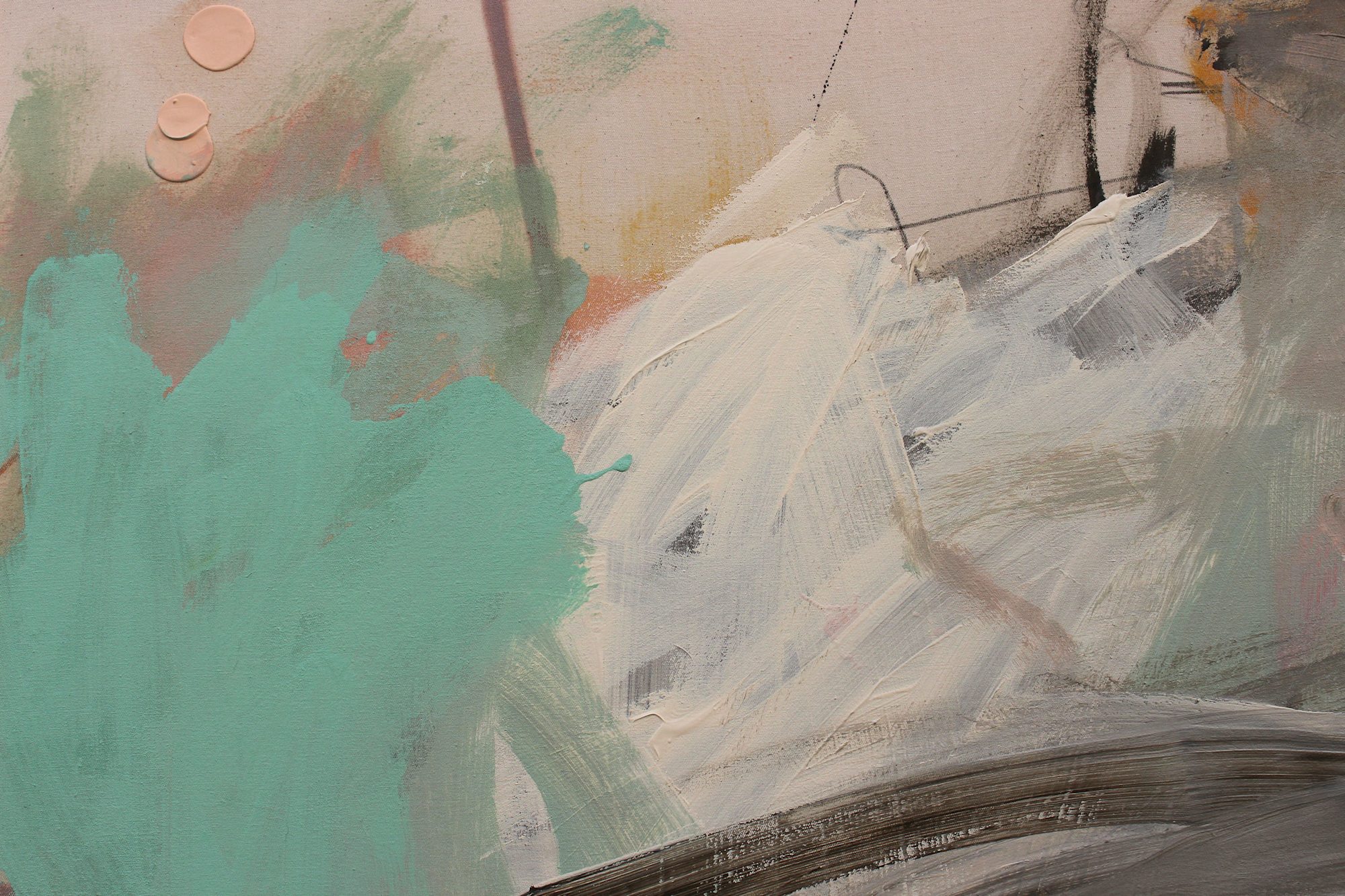 In this painting, I've taken up the colors of the "DUALITY" works, but combined them with a cool mint green. The result is an elegant, rather restrained work that nevertheless radiates rhythm and energy through the gestural application of paint.