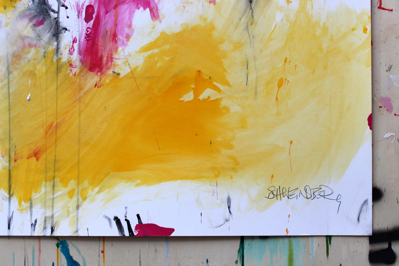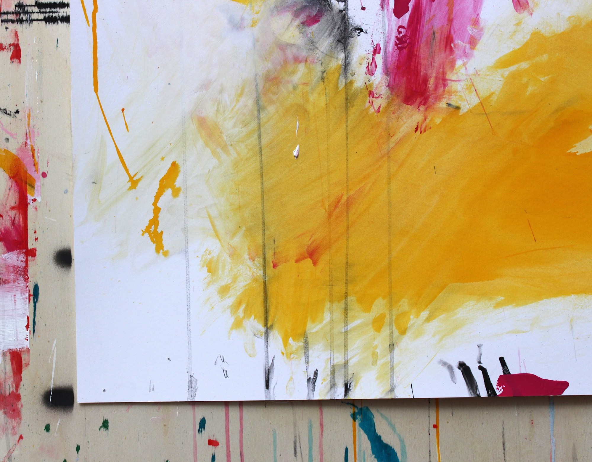 Please note that works on paper typically show signs of handling even when new, such as slightly bumped edges or small tears. These are not defects but an inherent part of the artistic process. The works are created in the studio under real working conditions and may, during their creation, be attached to walls or worked on while lying on the floor using fluid paints. These traces reflect the direct, process-driven approach and are integral to the authenticity of the artwork.