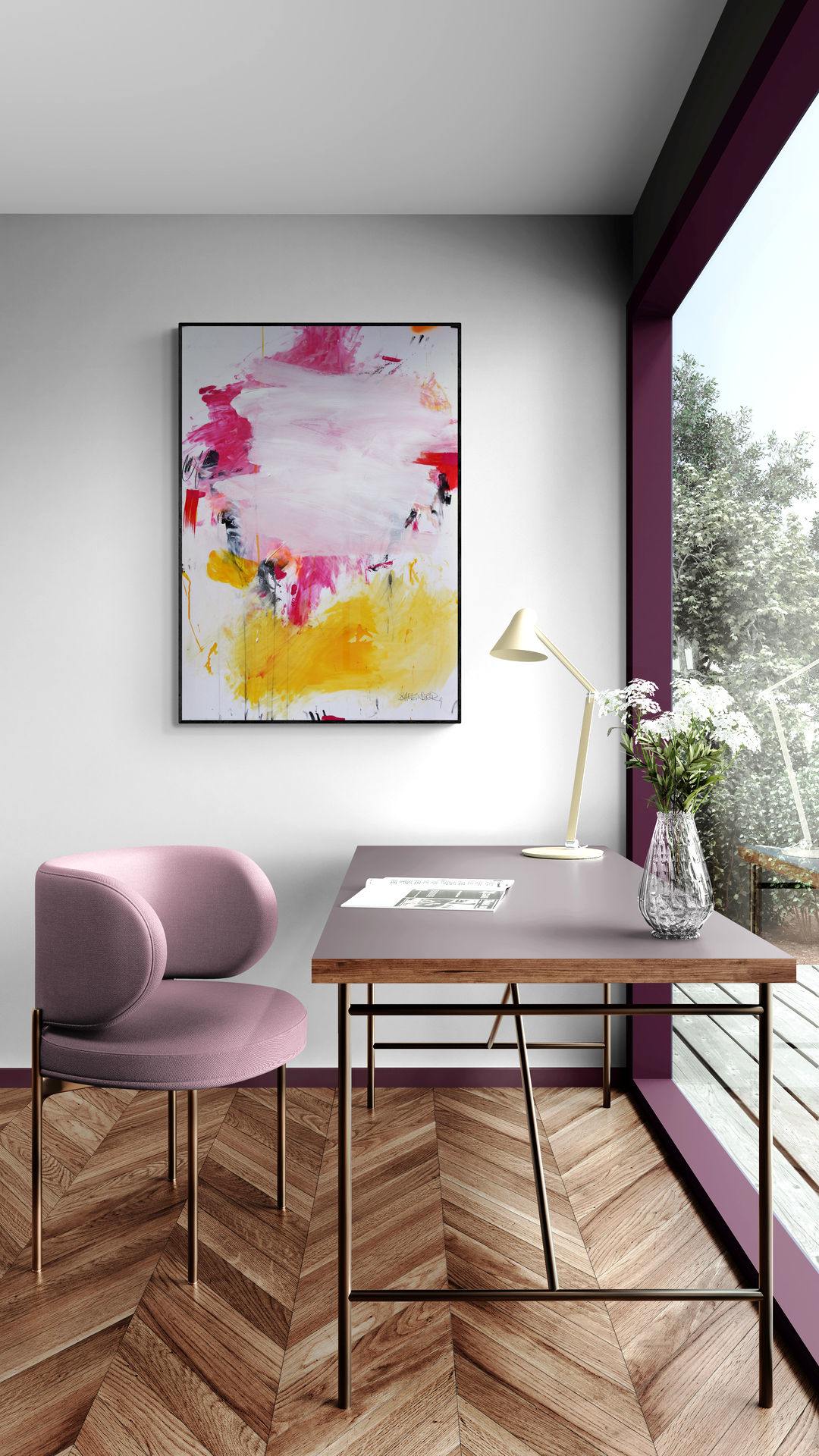 Despite the soft, “feminine” colors like pink, red and yellow, the painting feels raw and direct. That contrast was intentional. I wanted to create something with edge, something that doesn’t hide behind a polished façade.