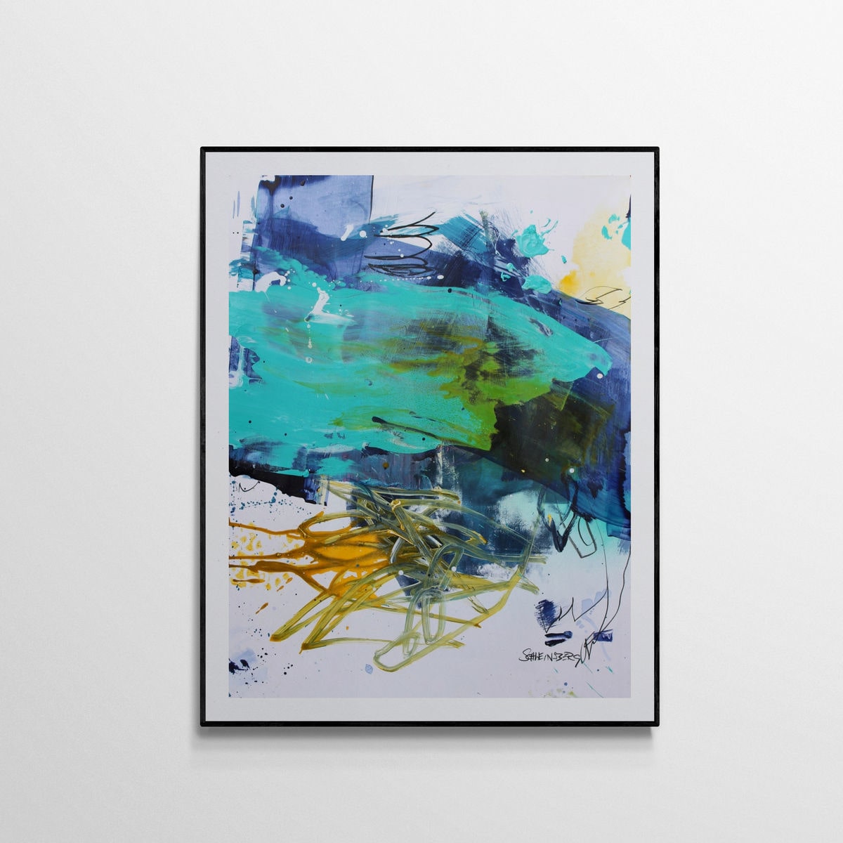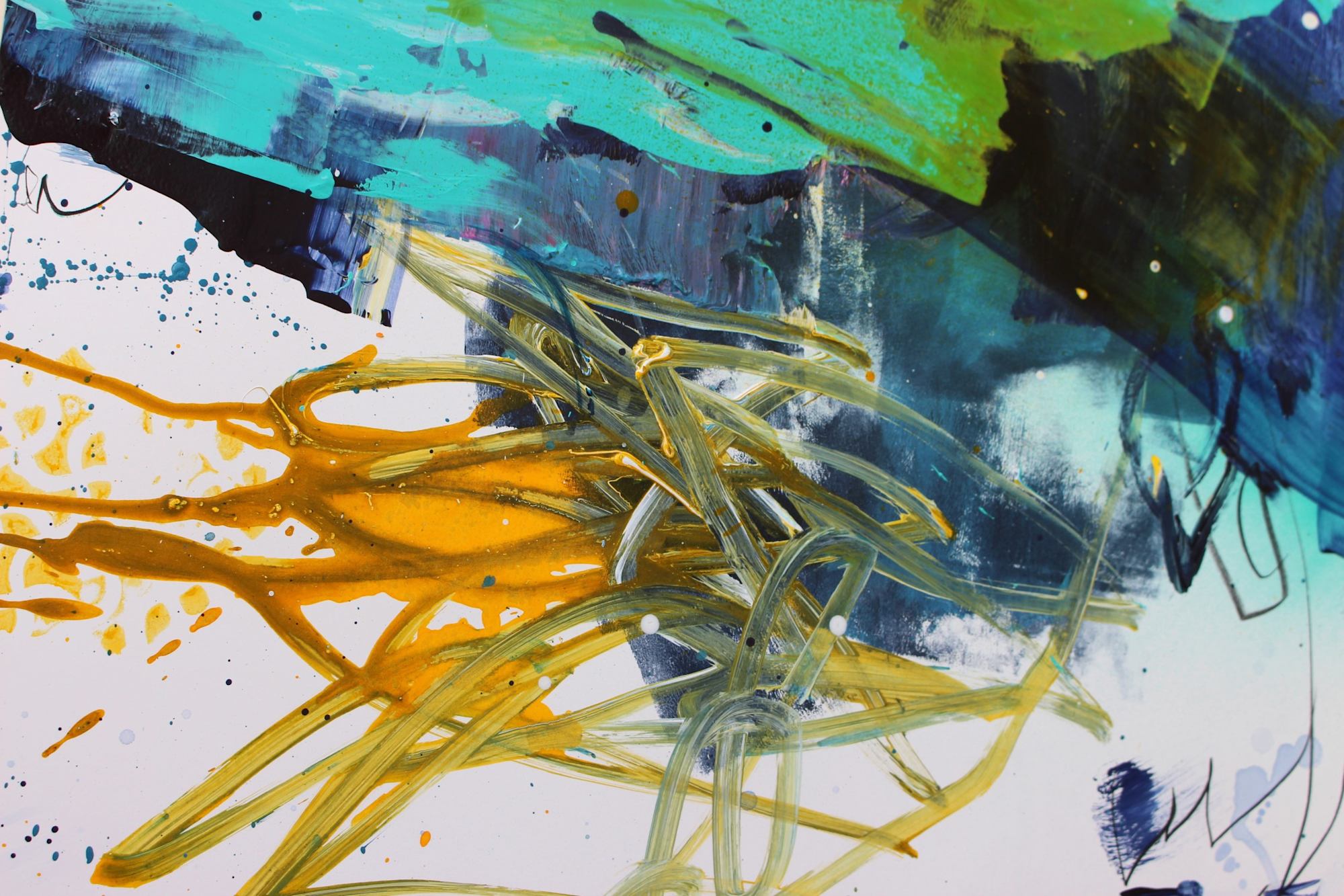 Keywords: original artwork, abstract painting on paper, turquoise and yellow art, gestural abstraction, medium sized art, water inspired abstract, blue art, contemporary expressionism, mixed media paper