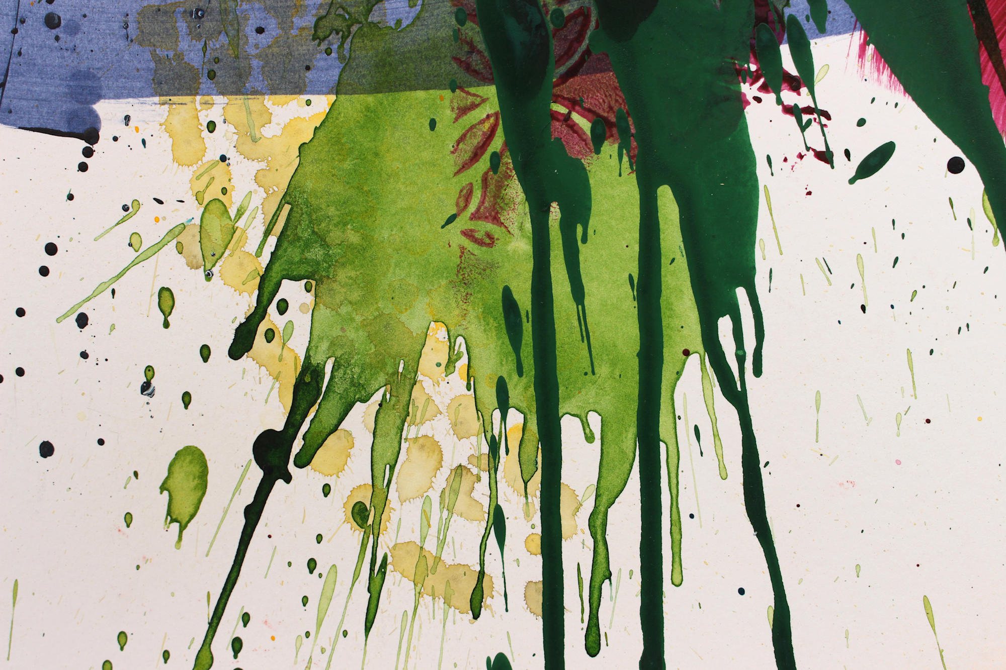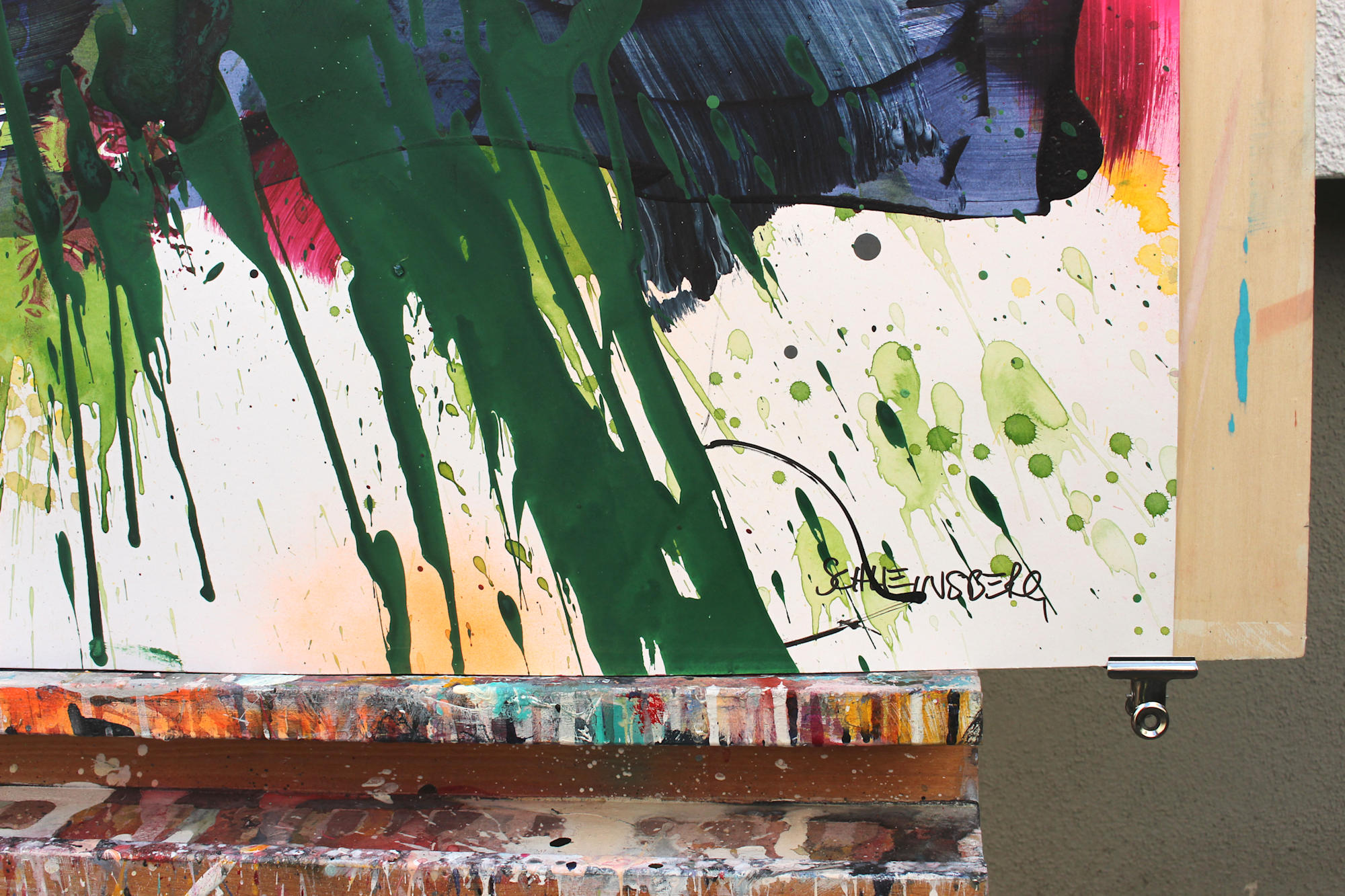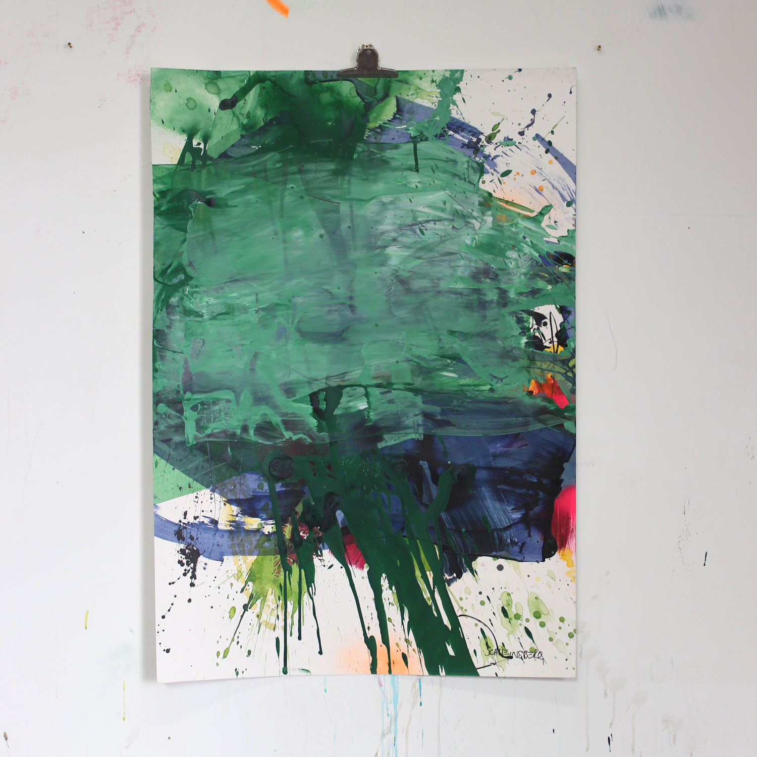 Please note that works on paper typically show signs of handling even when new, such as slightly bumped edges or small tears. These are not defects but an inherent part of the artistic process. The works are created in the studio under real working conditions and may, during their creation, be attached to walls or worked on while lying on the floor using fluid paints. These traces reflect the direct, process-driven approach and are integral to the authenticity of the artwork.