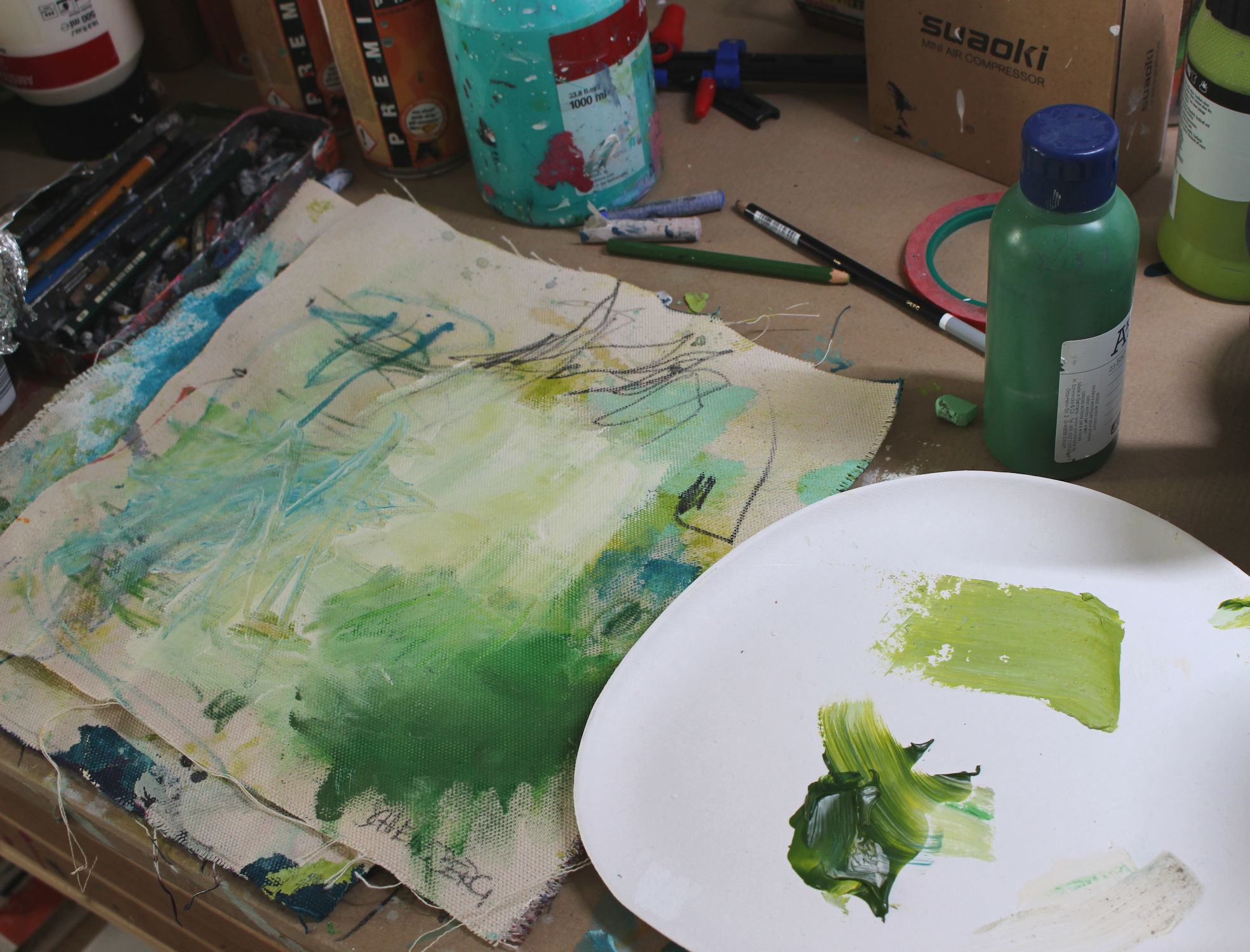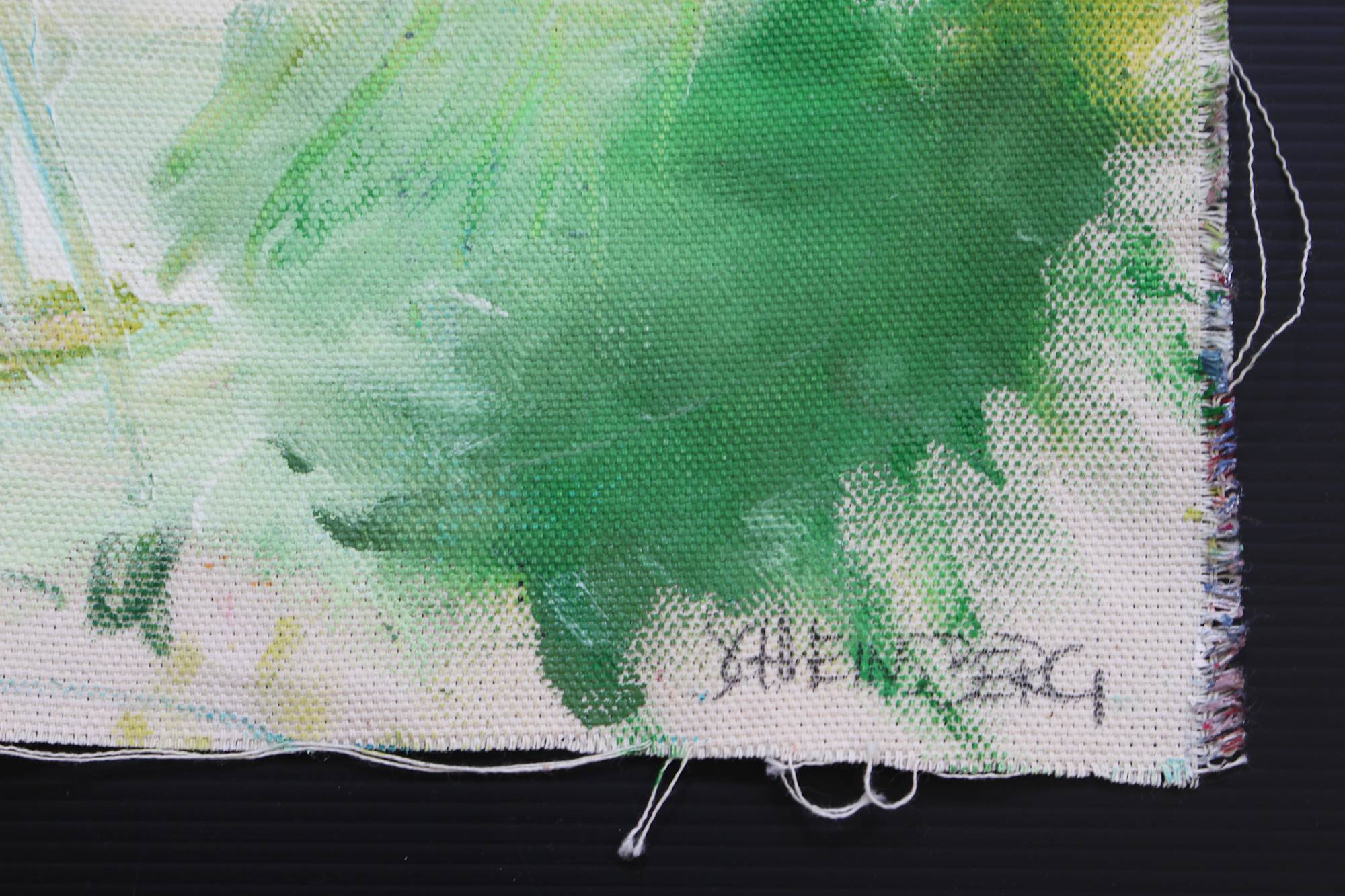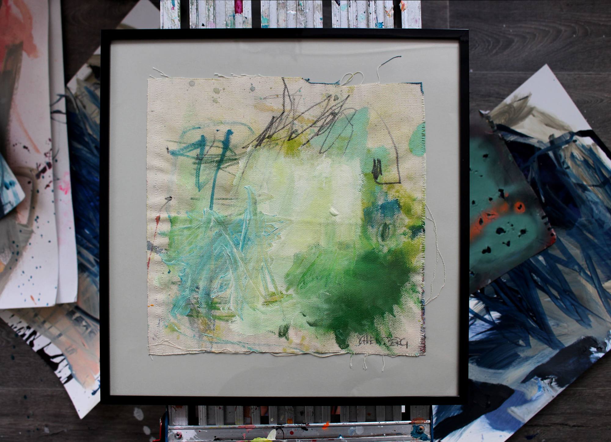 The "SNATCHES OF A CONVERSATION WITH ART" series was born out of the canvas scraps that are often leftover from stretching canvases. I use them to create these small, independent works within this series. Framed so, that the cut edges and canvas threads remain visible, they are wonderful, unique pieces.