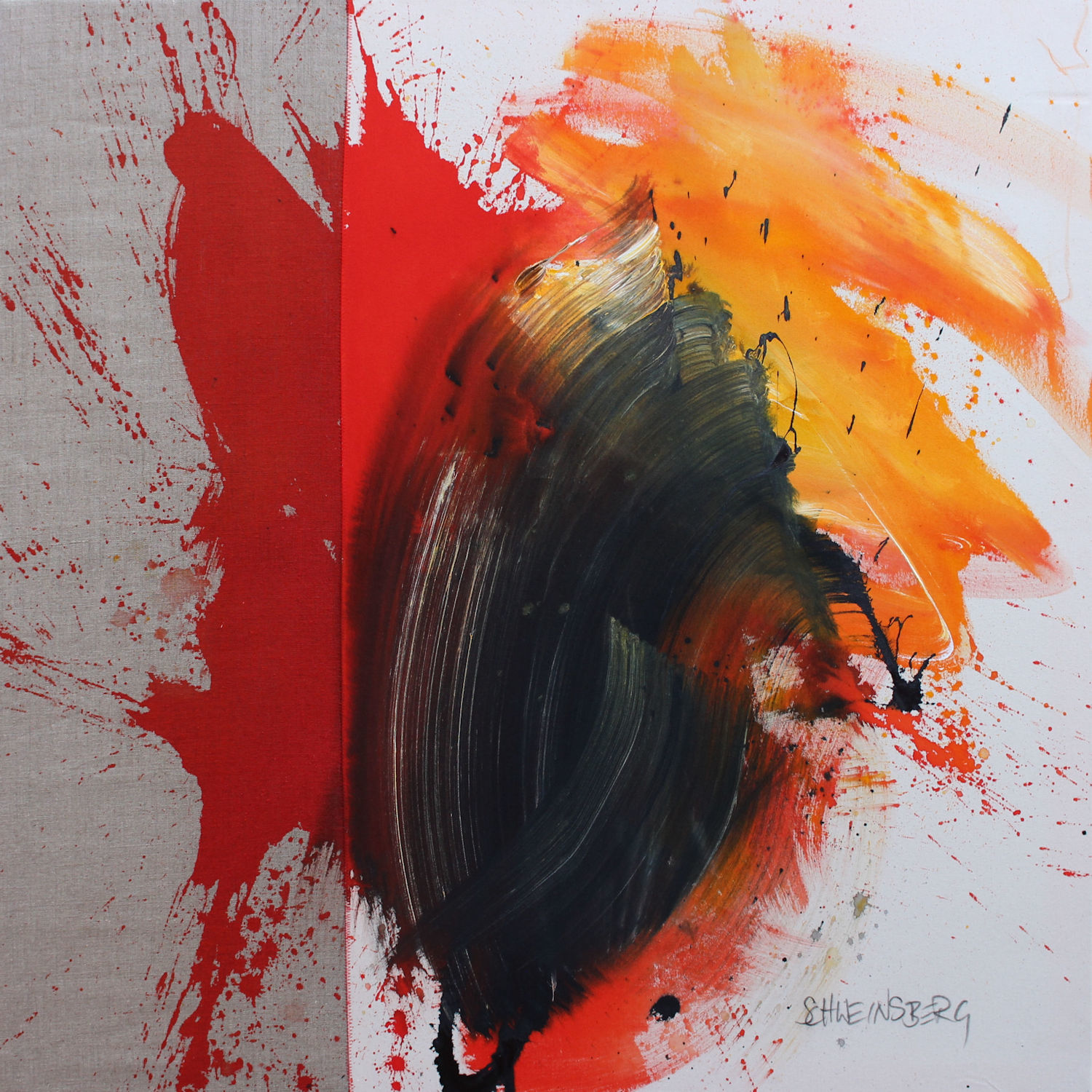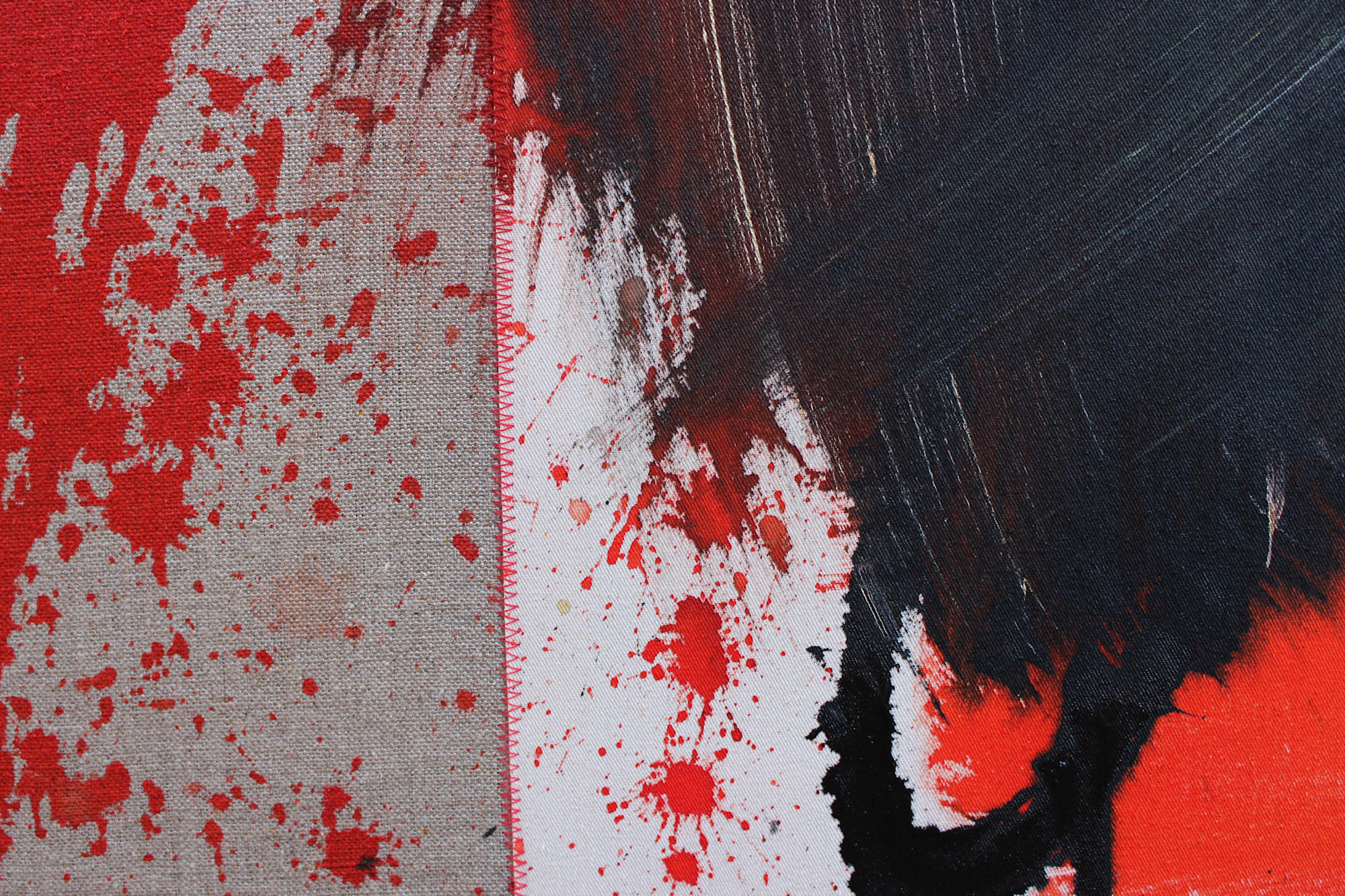 In this work, two types of canvas meet: linen and cotton, sewn together with visible stitches. And then a powerful explosion of red, orange, and blue. I love the clarity and purity this work exudes!
