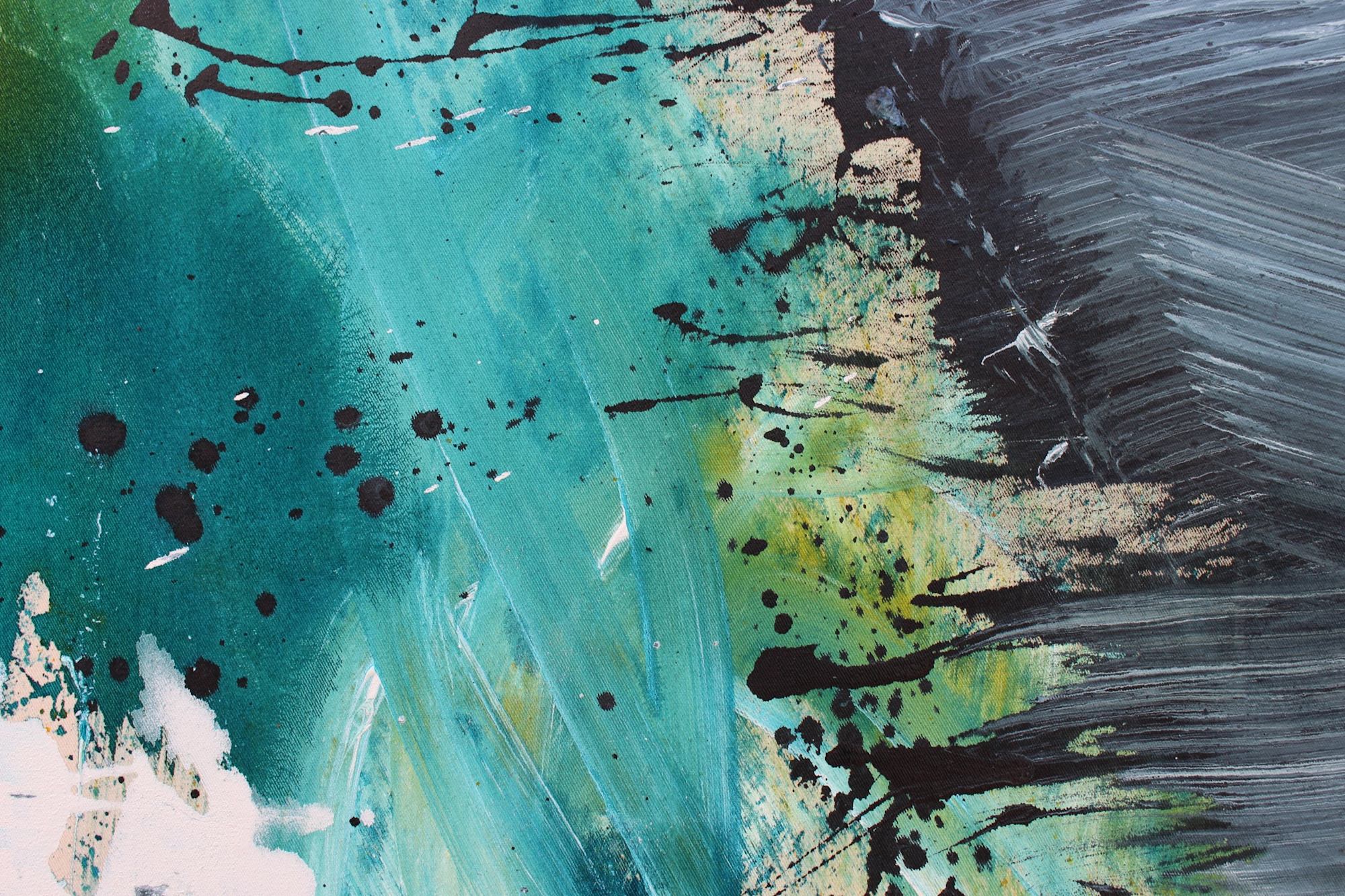 This painting makes one think of water and summer. Turquoise and green tones flow across the surface like waves, while yellow reflections recall sunlight shimmering on the sea. Against this brightness stands a bold, dark form - its presence reminding me of volcanic coastlines with their black sand beaches. The title came naturally, as a response to what the painting evoked.
