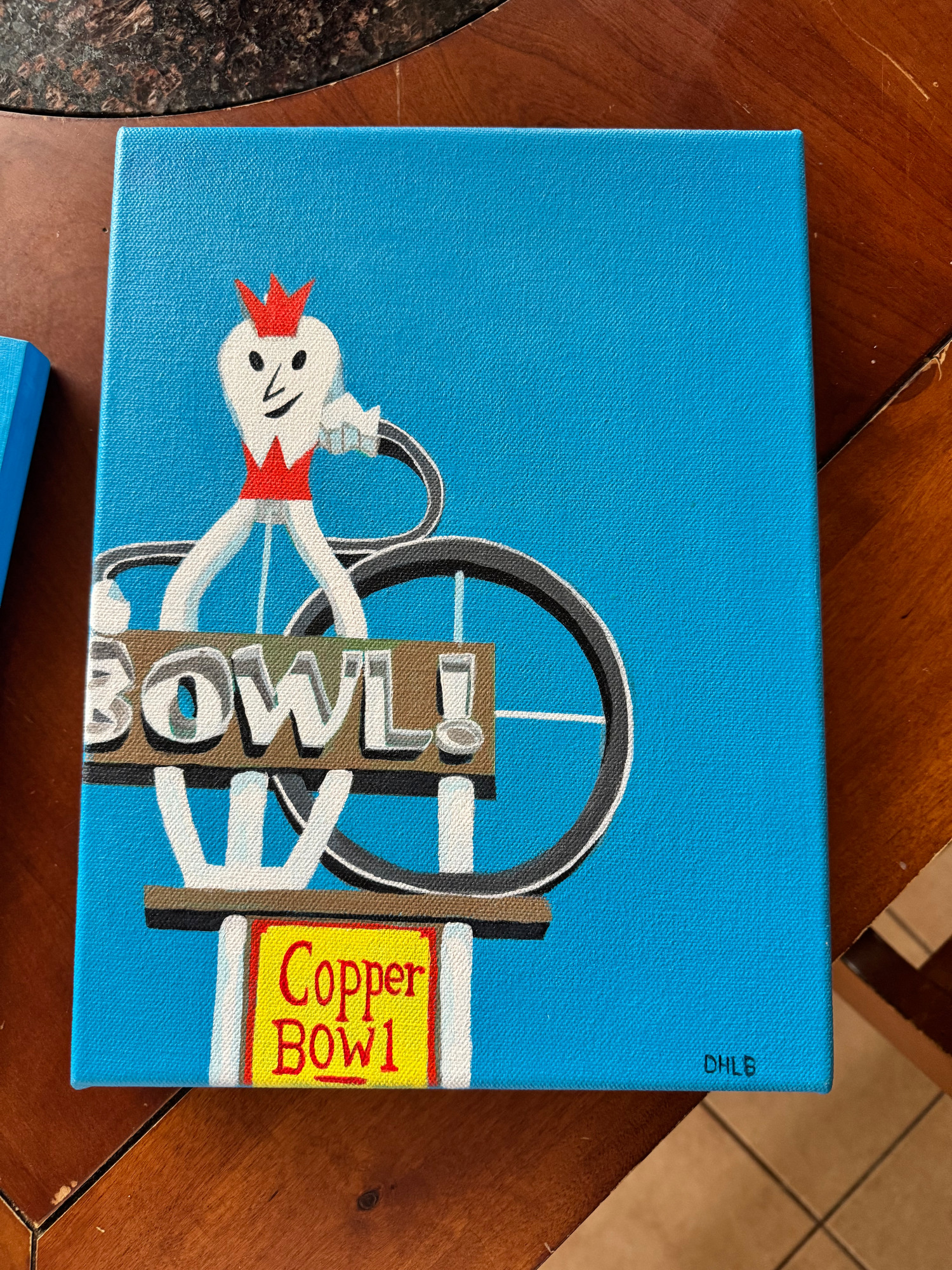 Bowling Through Time is an eye-catching acrylic on canvas piece that instantly transports the viewer to a nostalgic era. The artwork showcases a vibrant retro sign set against a stark blue sky, which exudes a sense of timelessness. Dominating the composition is a whimsical bowling pin figure with a white face and a red crown, arms playfully outstretched, perched at the top of the sign. Below this, the bold, angular text "BOWL!" grabs attention in vivid block letters.