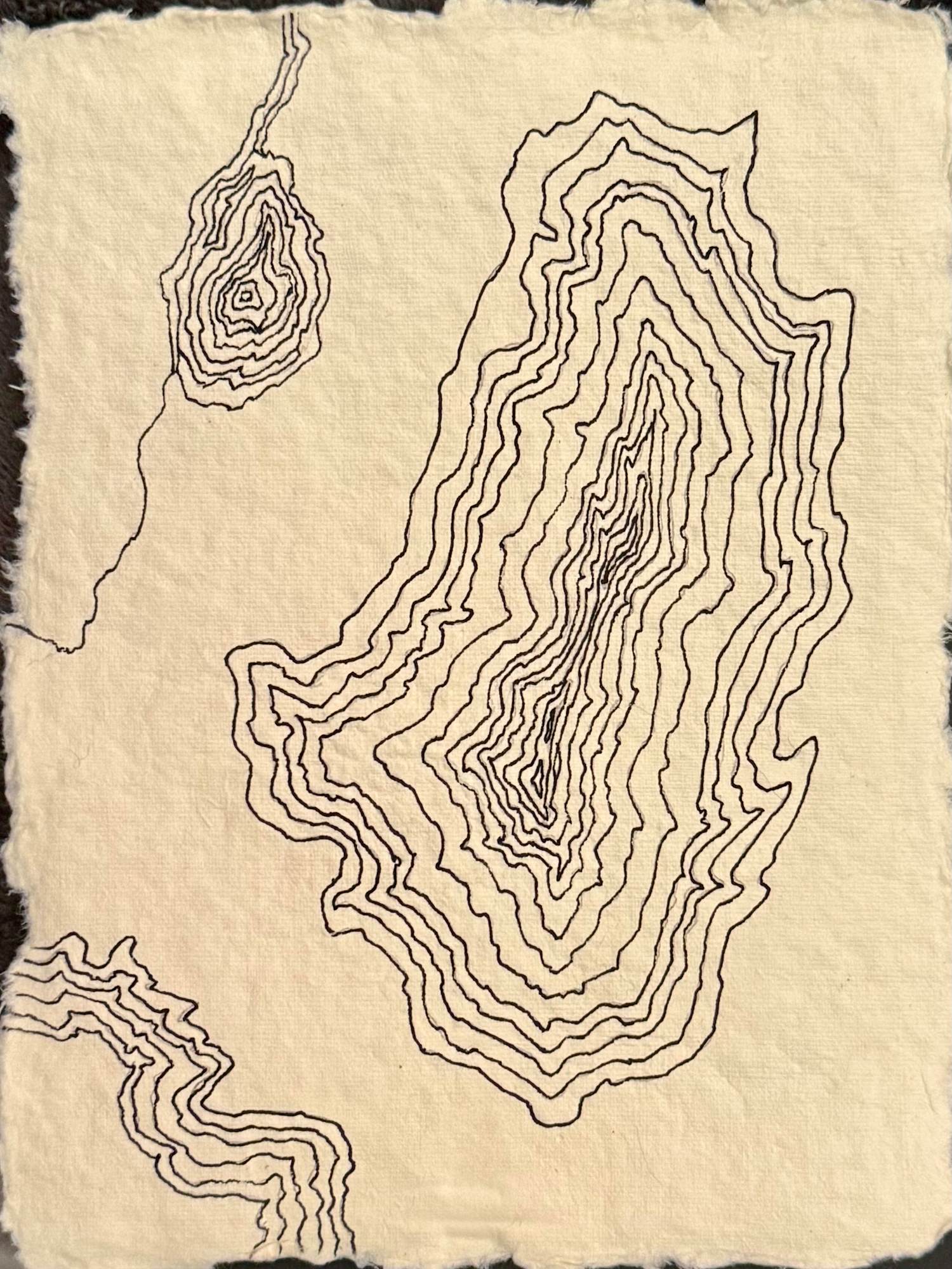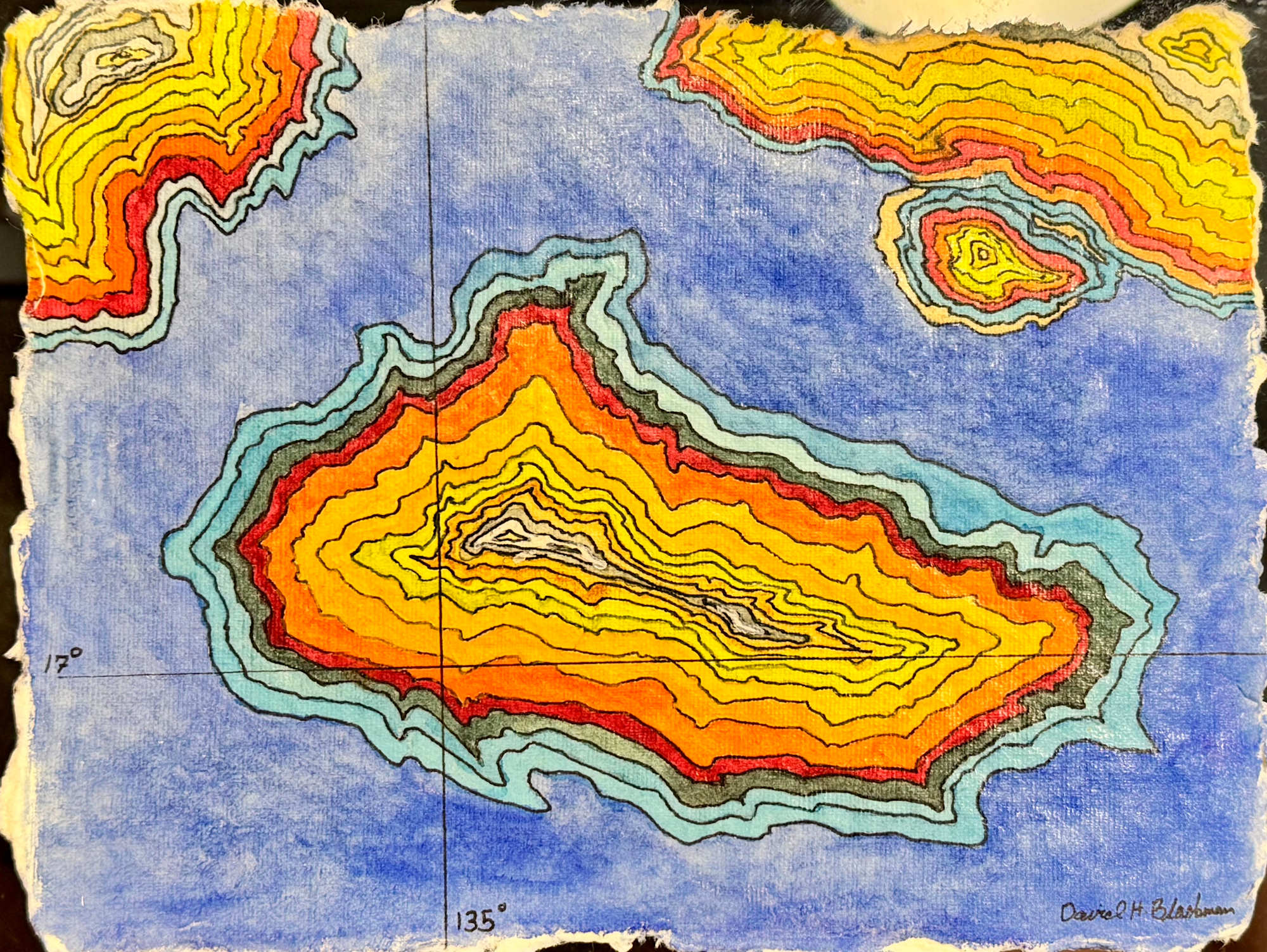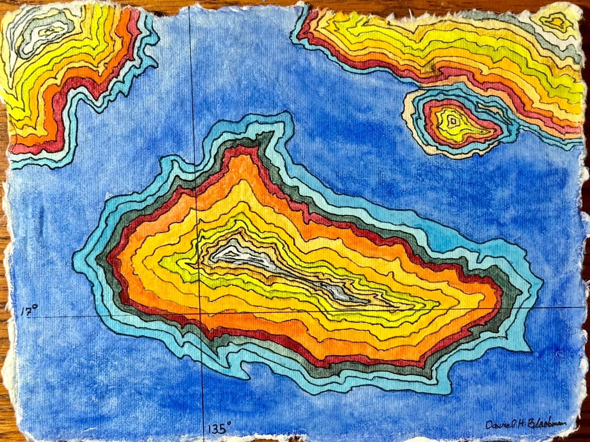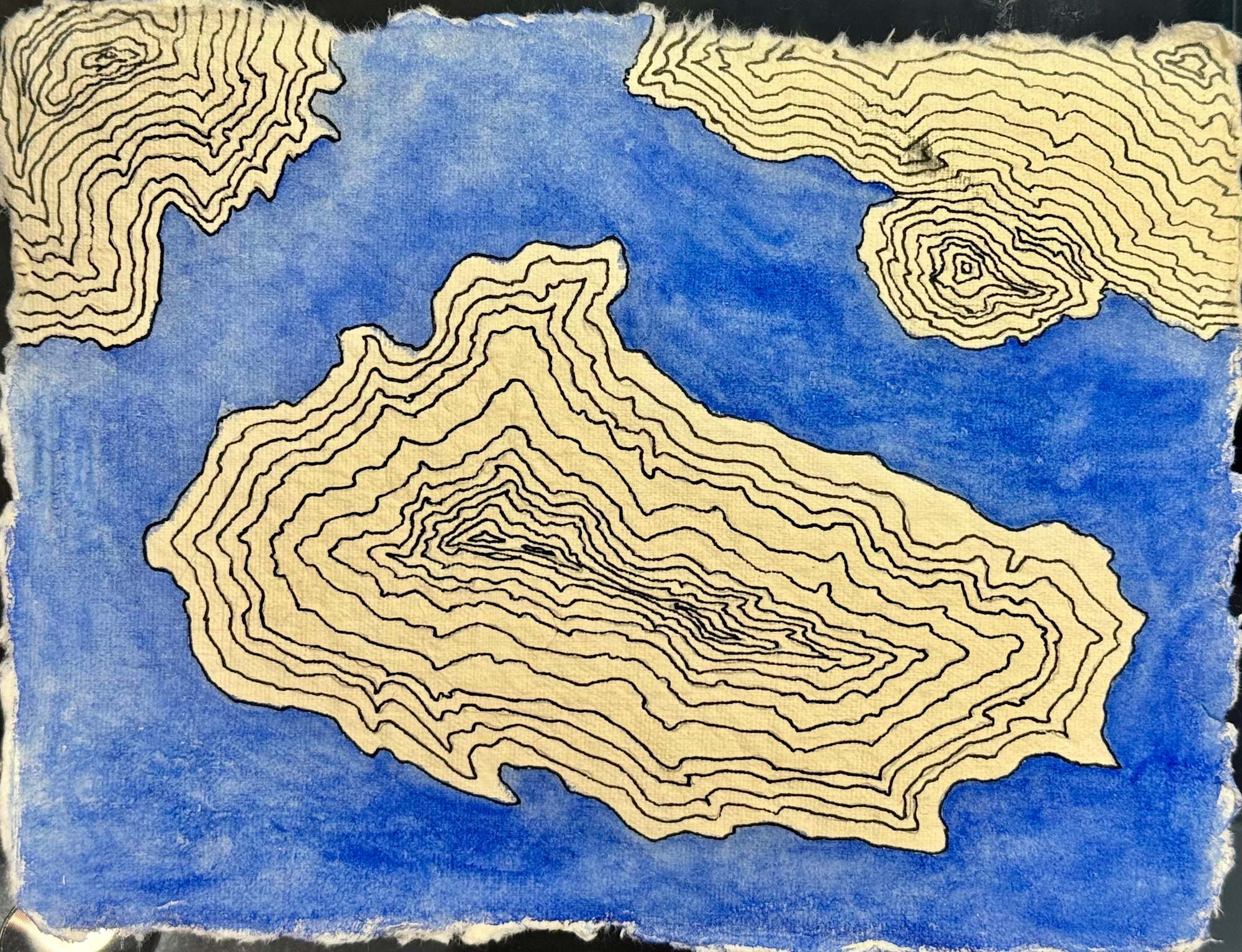 Latitude of Ember Shores presents a carefully layered topographical map rendered in watercolor and ink on textured paper. At its center, a distinct island emerges through a series of concentric contour lines, shifting in tone from pale gray and white at the core to intense yellows, oranges, and deep browns along the edges. This gradient suggests both elevation and warmth, inviting closer examination of the island’s form. Surrounding it, water is mapped in varied blues, visually contrasting with the land and evoking depth or distance. Two smaller landforms, echoing the central island’s contour style and color palette, appear at opposite upper corners, balancing the composition. Latitude and longitude lines anchor the piece in a tangible spatial context, reinforcing its connection to real-world geography. The hand-drawn quality and torn edges of the paper emphasize a tactile, organic approach that resists mechanical precision, celebrating the natural complexity found in maps and landscapes alike.