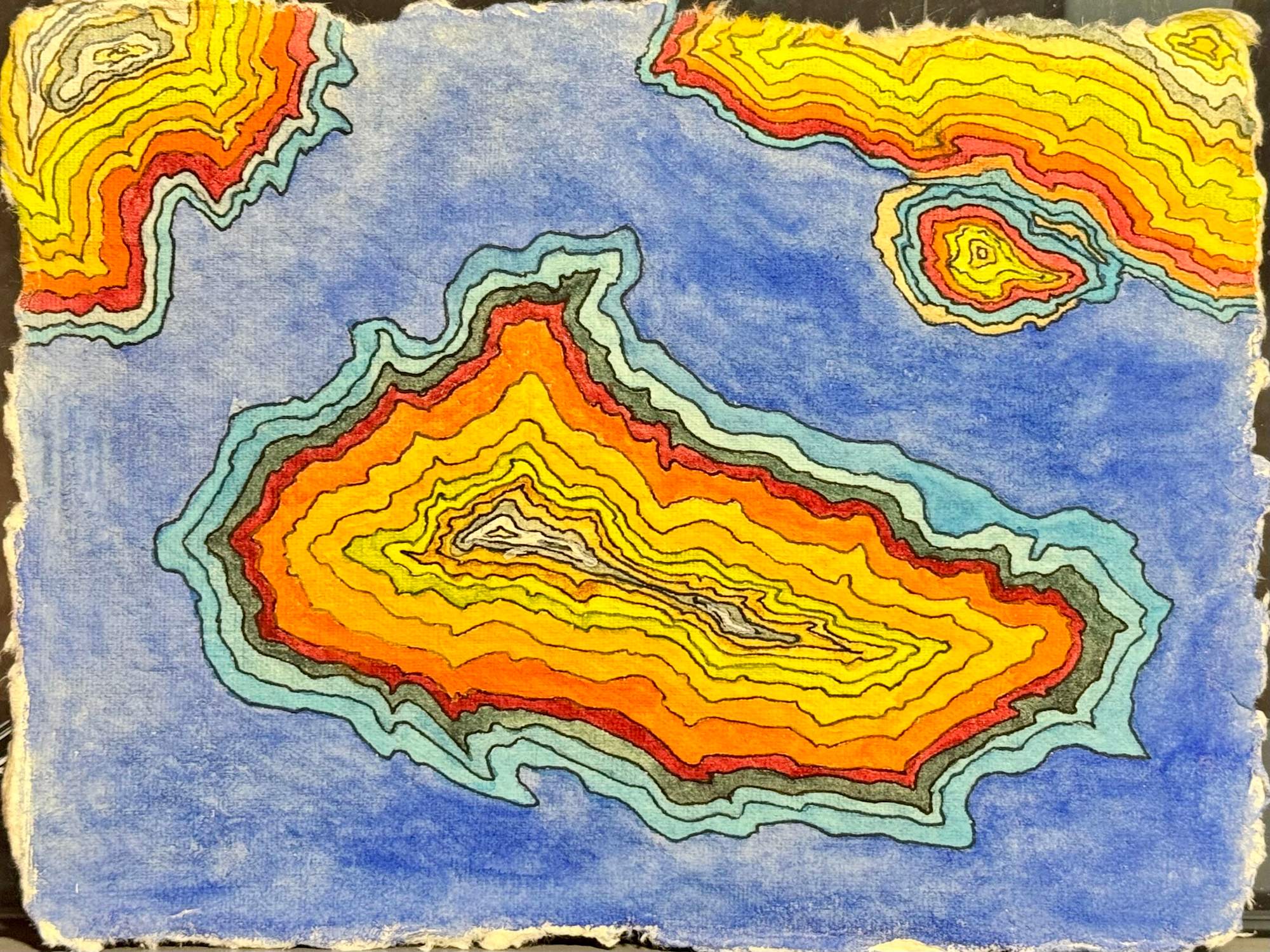 Latitude of Ember Shores presents a carefully layered topographical map rendered in watercolor and ink on textured paper. At its center, a distinct island emerges through a series of concentric contour lines, shifting in tone from pale gray and white at the core to intense yellows, oranges, and deep browns along the edges. This gradient suggests both elevation and warmth, inviting closer examination of the island’s form. Surrounding it, water is mapped in varied blues, visually contrasting with the land and evoking depth or distance. Two smaller landforms, echoing the central island’s contour style and color palette, appear at opposite upper corners, balancing the composition. Latitude and longitude lines anchor the piece in a tangible spatial context, reinforcing its connection to real-world geography. The hand-drawn quality and torn edges of the paper emphasize a tactile, organic approach that resists mechanical precision, celebrating the natural complexity found in maps and landscapes alike.