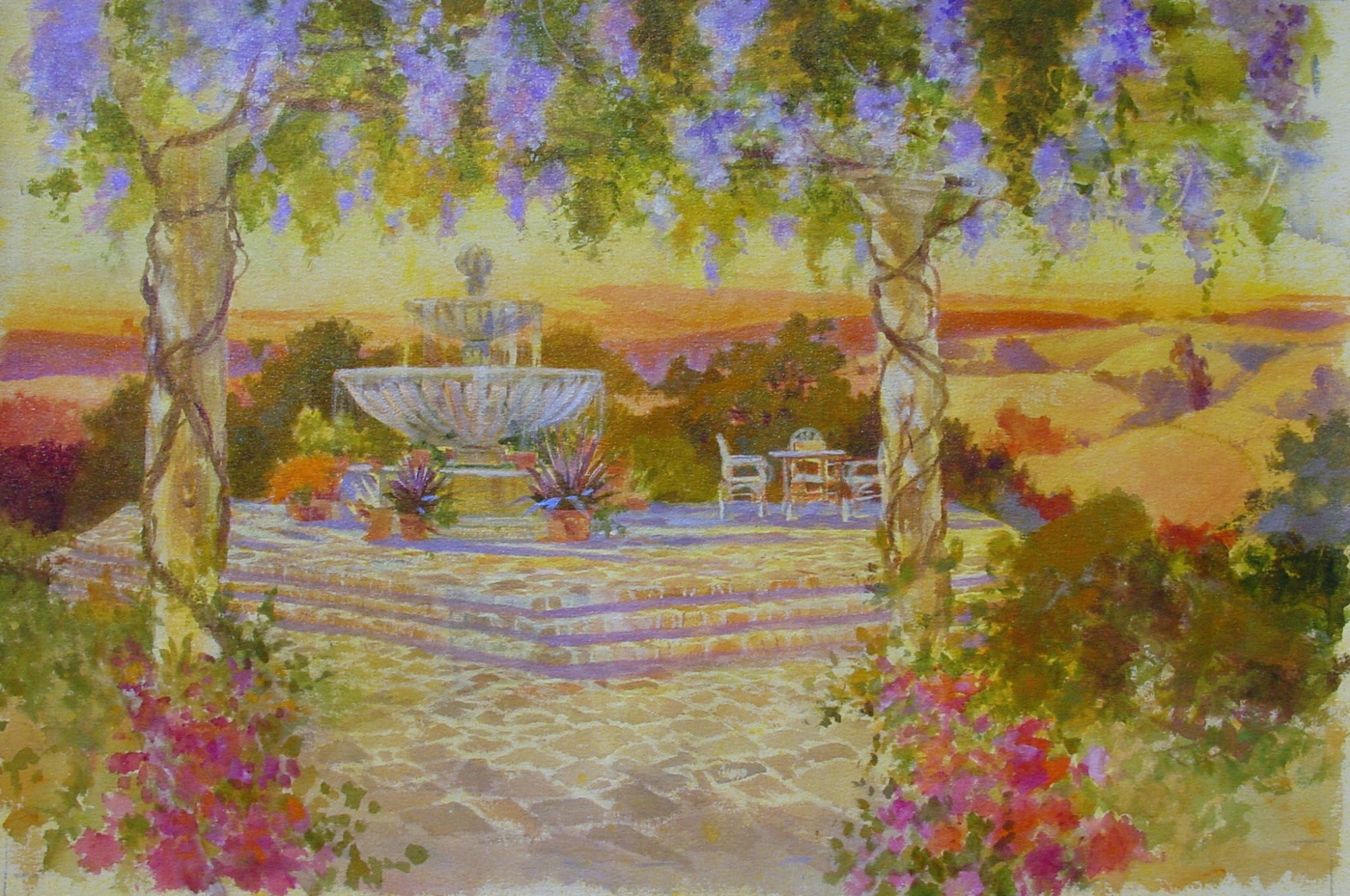 Wisteria vines and pillars with fountain.