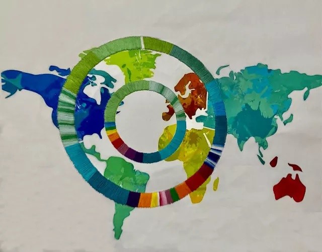 Global Connections in Me - embroidery on canvas (printed map)