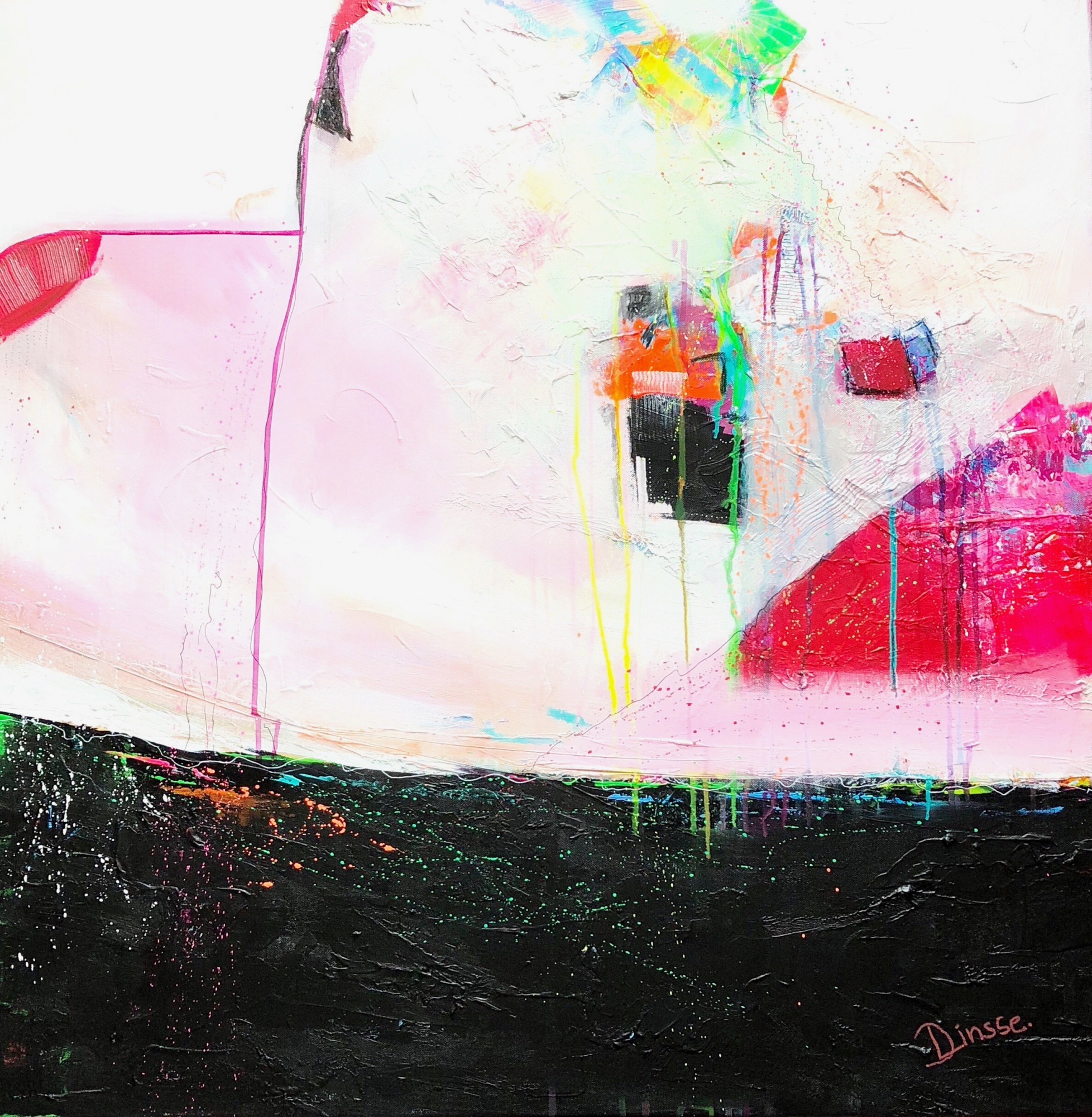 My artwork „Roots and Wings“, with its strong base and complimenting light elements, shapes and lines, was inspired by the strong feeling of thankfulness for my roots as well as my wings. Like my other paintings it is a square format and consists of various colorful, contrasting layers of acrylic paint, ink and charcoal. On your wall, it reminds you that you can spread your wings and fly, as your roots will support you.