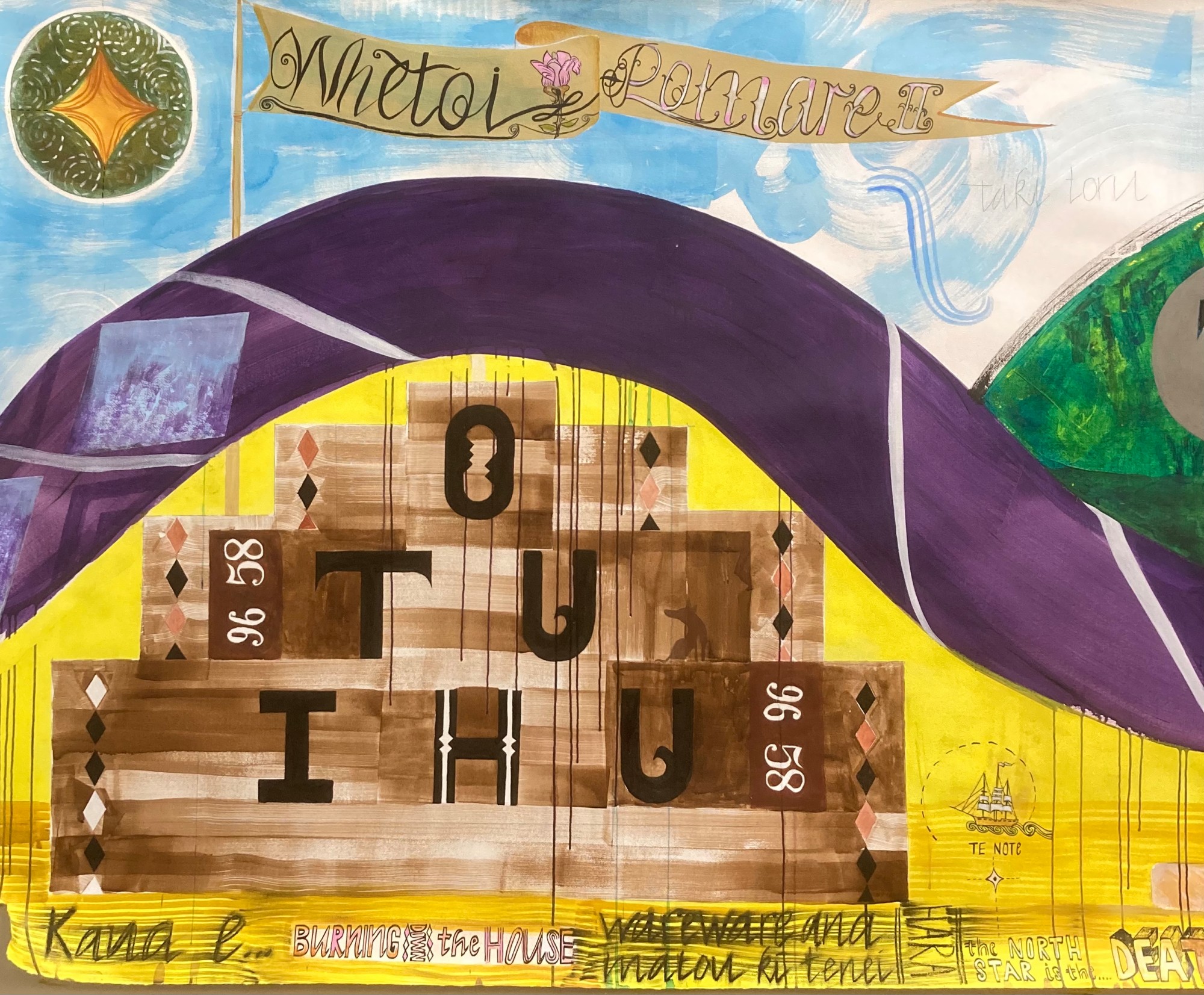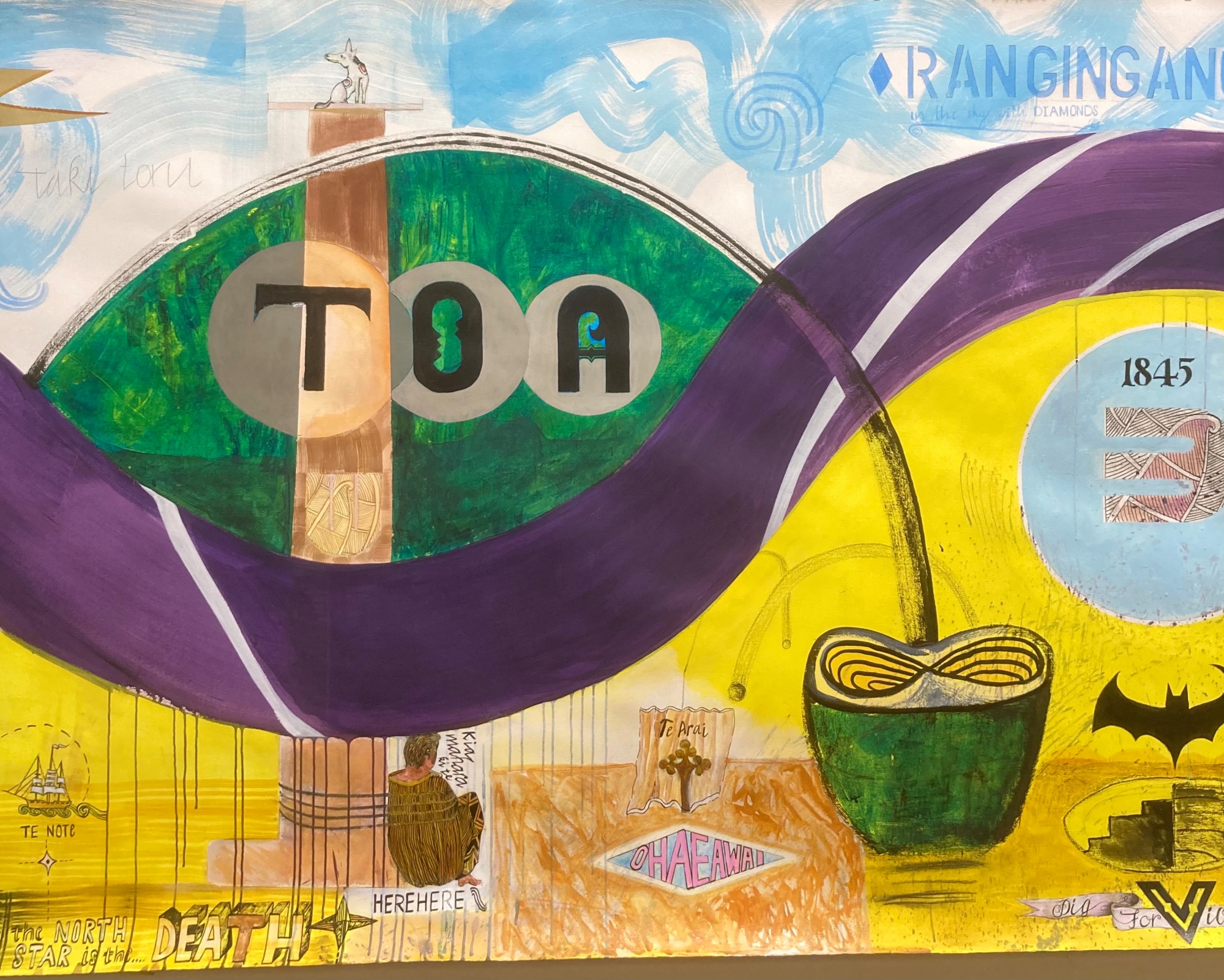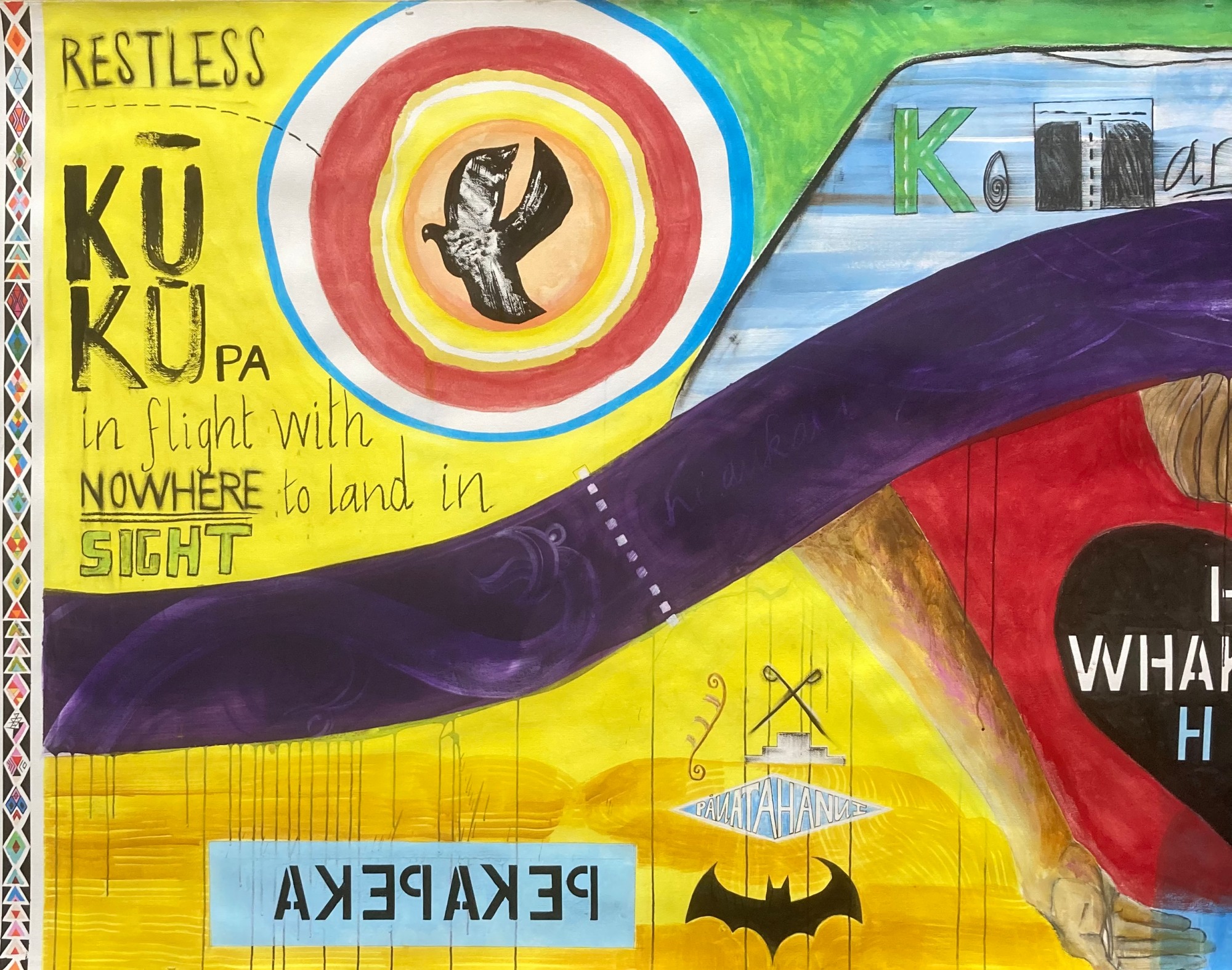 Ngā Mahi Aroha i tuku iho is a 9 metre long mural sized landscape featuring a river that unites the Taumarere and Kapiti regions through whakapapa links joining Ngāti Manu and Ngāti Raukawa ki Tonga. The primary whakapapa lines explored concern Pōmarenui II and Whatanui respectively and the marriage of the latter leader's daughter Ranginganana to Pōmare. The painting was exhibited in Waikanae which is just up the road from an historic battle site involving Te Rangihaeta at Pauatahanui. There are references to the Ruapekapeka site on the left of the image including reference to the sacking of the Ōtuihu, the pā of Pōmare, his Ngāti Manu people and their wealth by the British Navy. The painting 'Nightmares Begin With These Numbers' looks more closely at the injustice of this sacking and the subsequent kidnapping and imprisonment of Pōmare and his daughter and the taking of the land (currently being negotiated with between a Pākeha landowner and the Crown in favour of a return of the asset to Ngāti Manu.