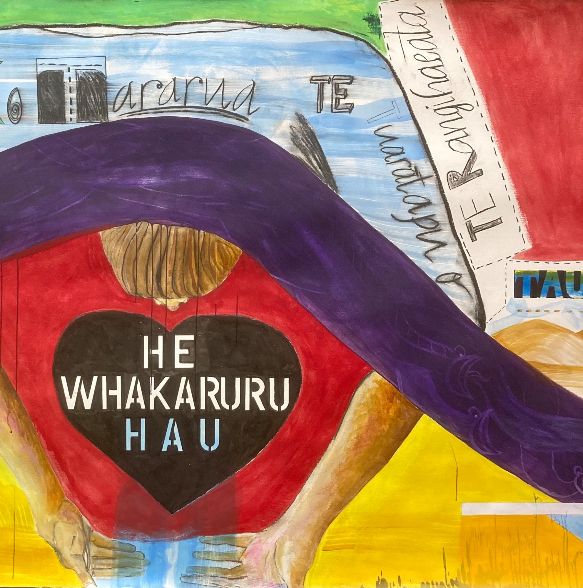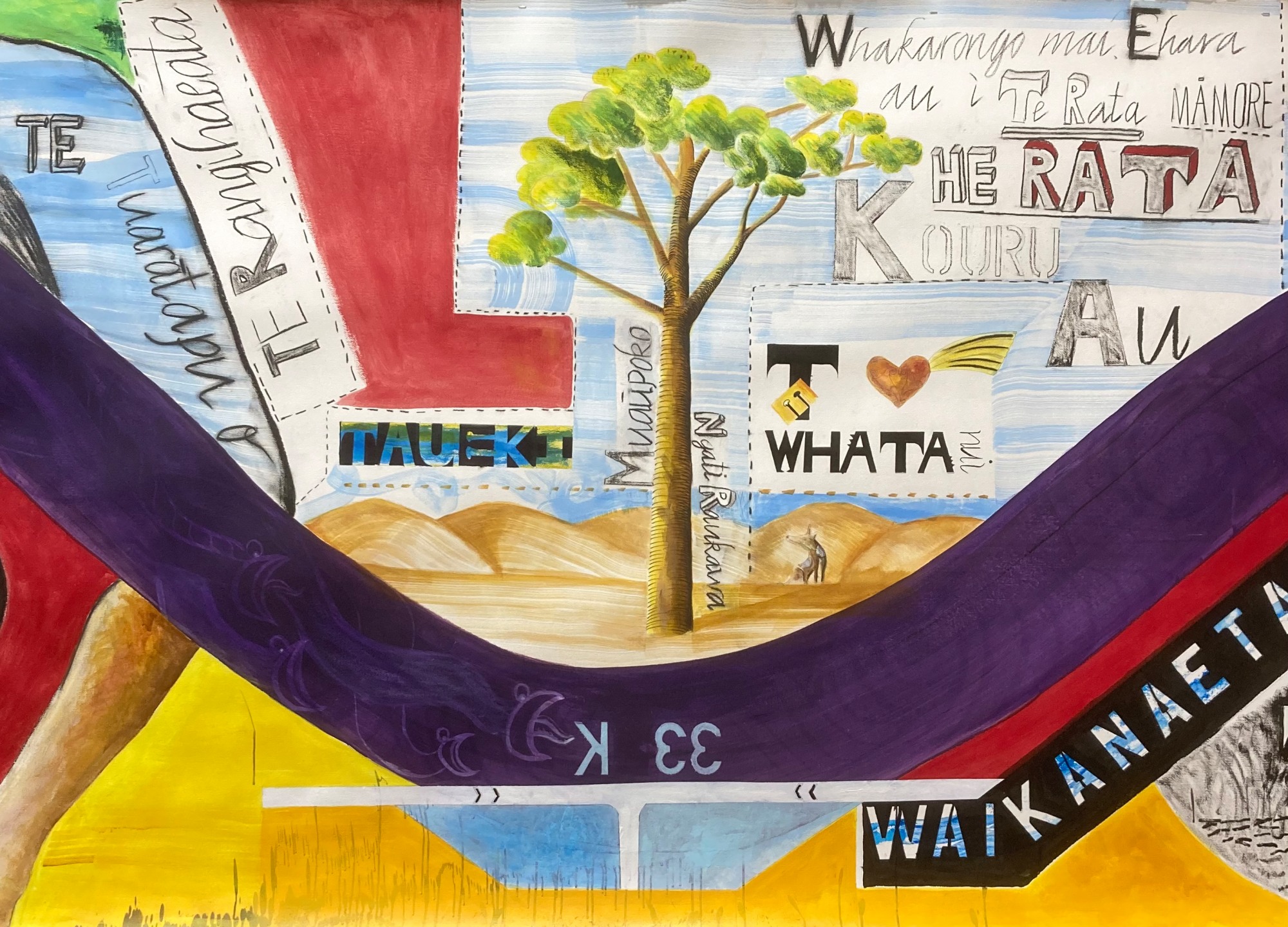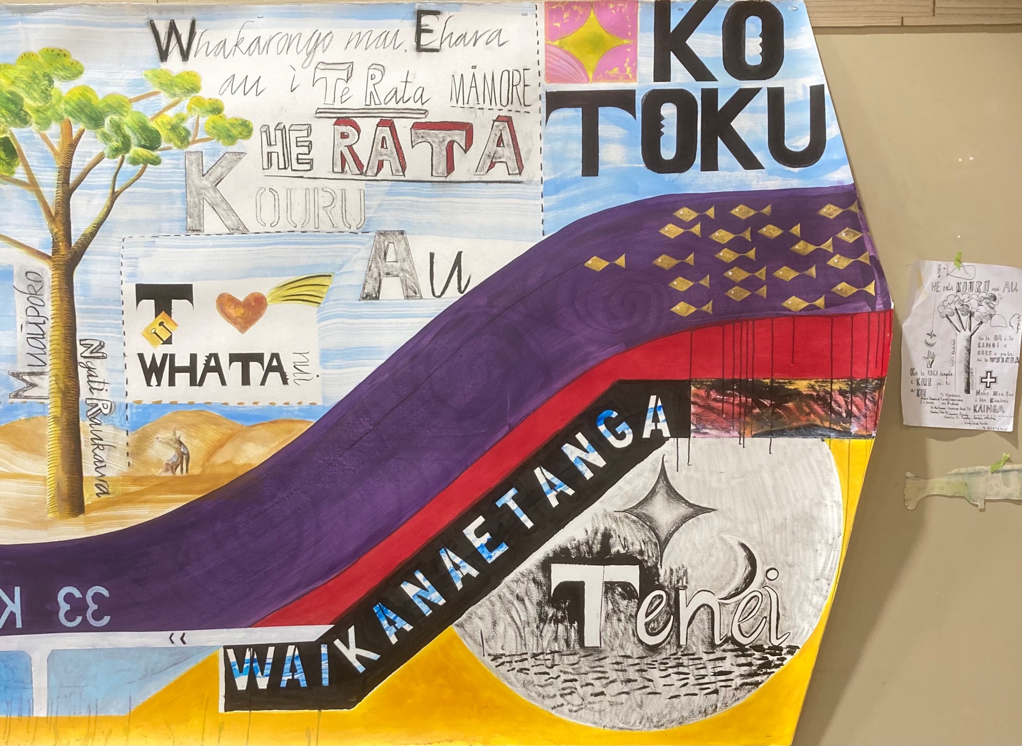 - Subject Matter: mural sized landscape featuring a river that unites the Taumarere and Kapiti regions through whakapapa links joining Ngāti Manu and Ngāti Raukawa ki Tonga