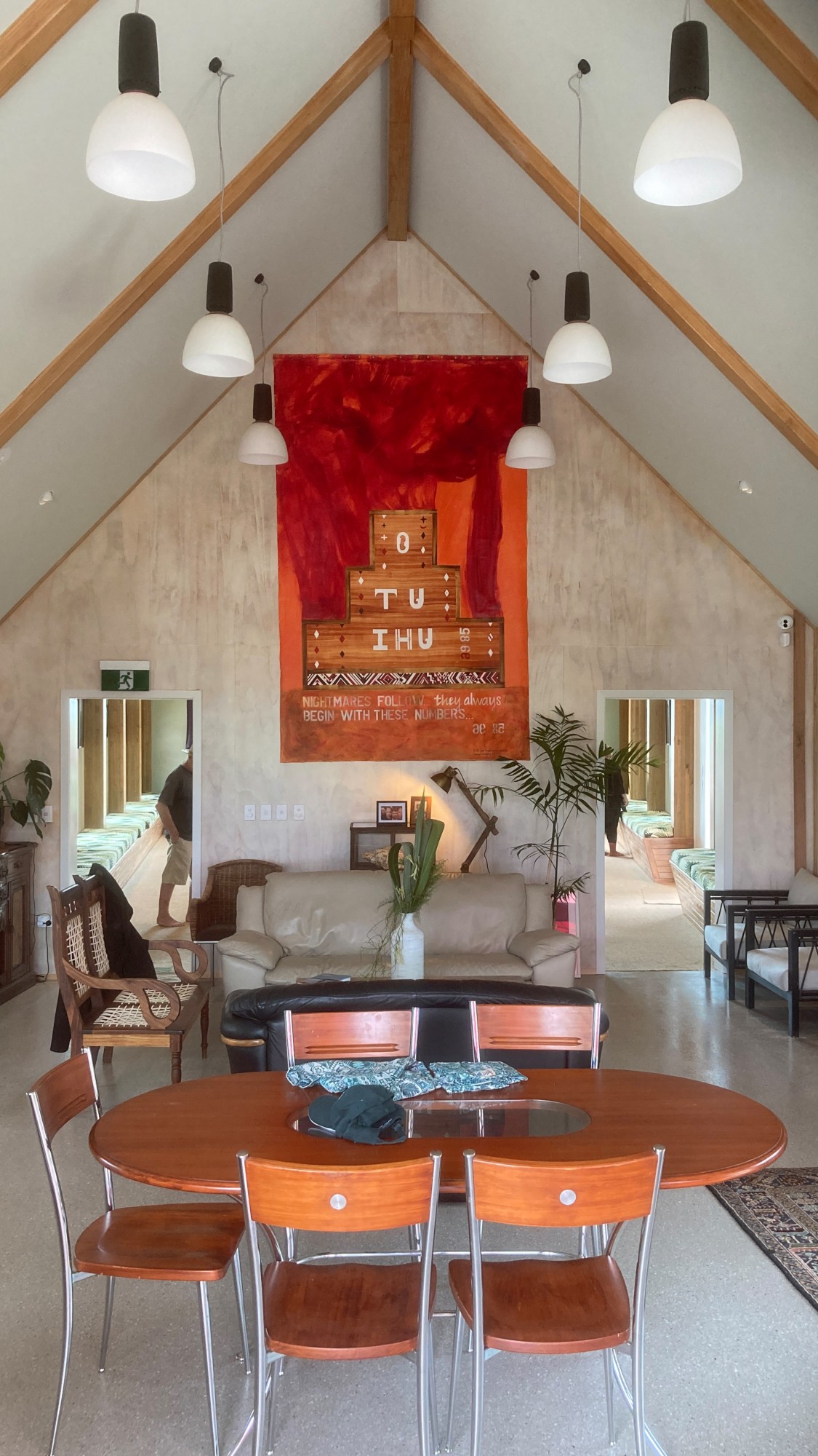 Both this canvas and the rear section of the 'Nga Mahi Aroha…' reference the sacking of our Ngāti Manu ancestor Whetoi Pomare II's Pā Otuihu at the entrance of the Taumarere River, Bay of Islands by the 58th and the 96 British Regiments in 1845. The loss of Ōtuihu and the wealth of Ngāti Manu has never been recovered. Each year Ngāti Manu remember the sacking of Ōtuihu. I attended one of these wānanga at our ancestral whare at Karetu, Taumarere 'Bay of Islands' where a local kaumatua advised, kaua e wareware ngā hara 'never forget the injustices of Ōtuihu'. This clearly indicates that it's sacking in 1845 and the repercussions of that colonial act continue to reverberate in the present.